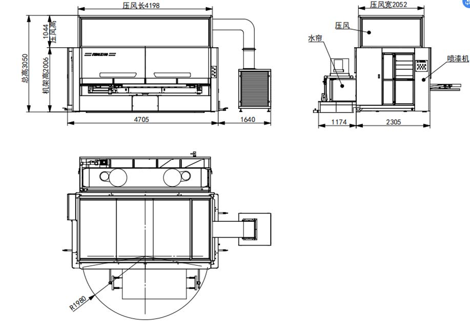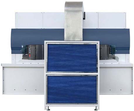 Фронтальная лицевая завеса улавливает окрасочный туман, а поток воздуха, создаваемый вентилятором, также осуществляет втягивание загрязненного воздуха.