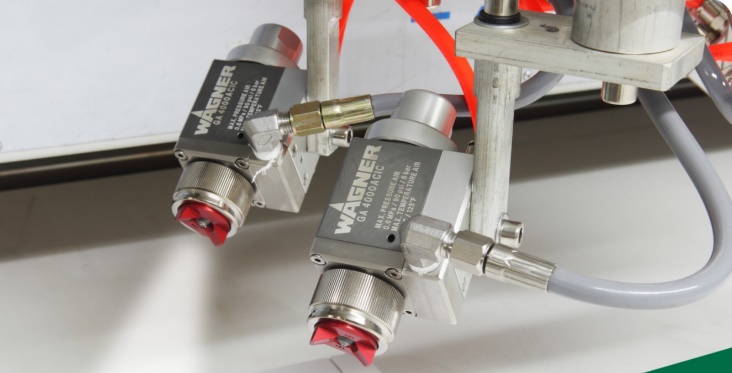 На рабочей руке устанавливается два пистолета, ход по вертикальной оси составляет до 350 мм. Держатели для пистолетов могут быть спозиционированы под различные углы, в зависимости от различных форм-факторов заготовок. Распыление может производиться как на пласть заготовок, так и по торцам.