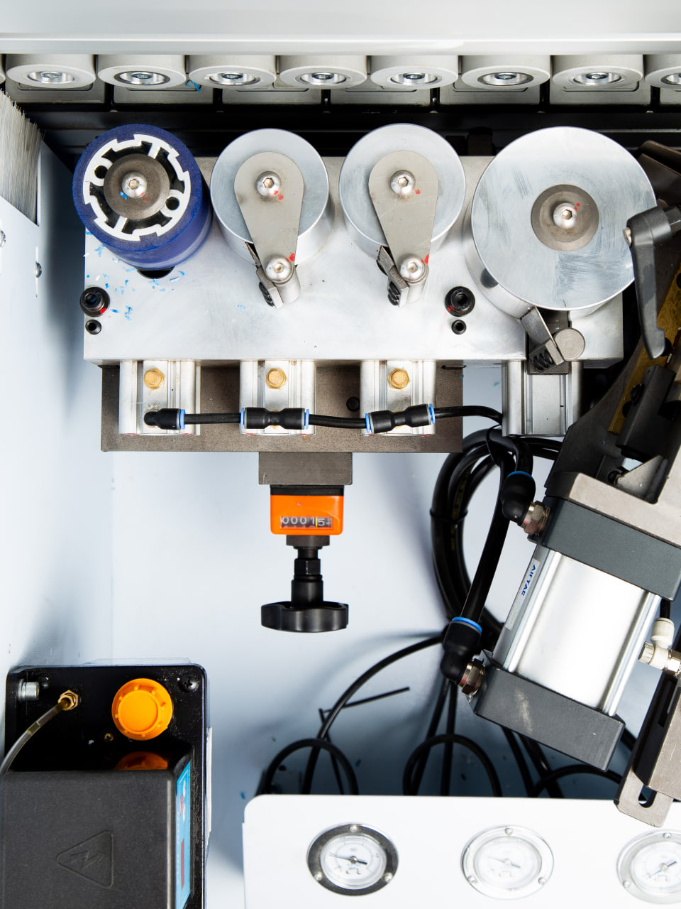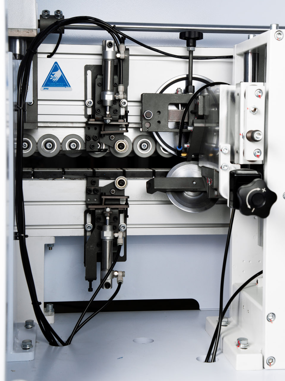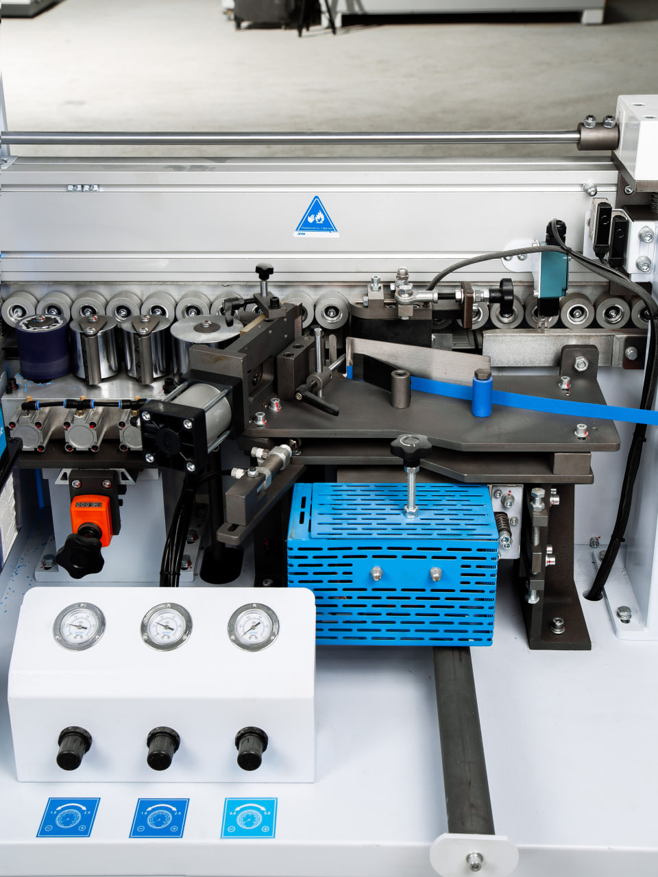 Узел подачи кромки точно и деликатно подает кромочный материал в зону приклеивания, обеспечивая минимальный свес кромки в начале детали. Может работать с рулонным кромочным материалом толщиной от 0,4 до 3 мм и с полосовым кромочным материалом.