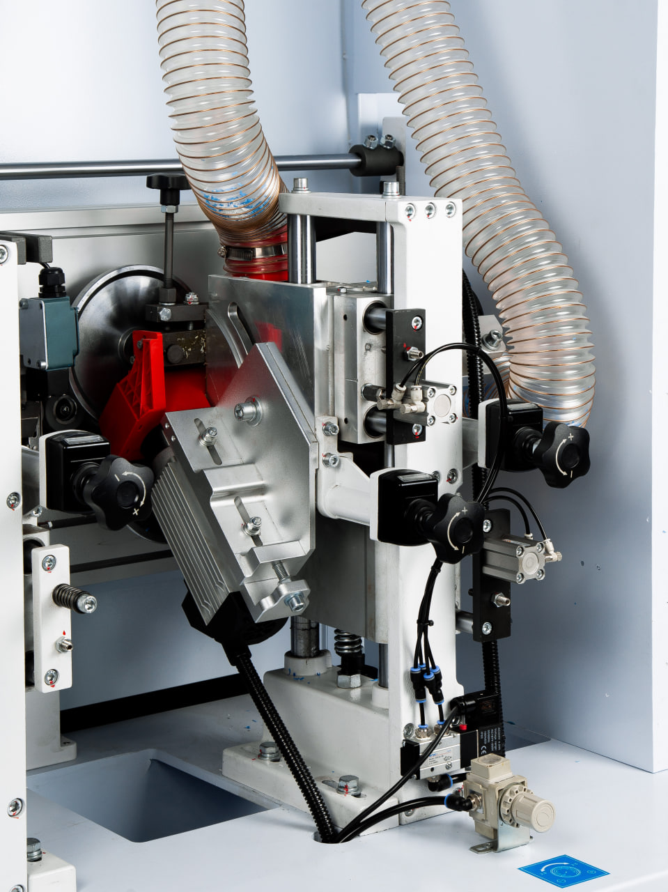 Торцовочный узел с двумя высокочастотными моторами: Оснащен высоко оборотистыми двигателями 12000 об/мин. Совершая движение по линейным направляющим, обеспечивает точное торцевание в размер пильными дисками D-100 мм.