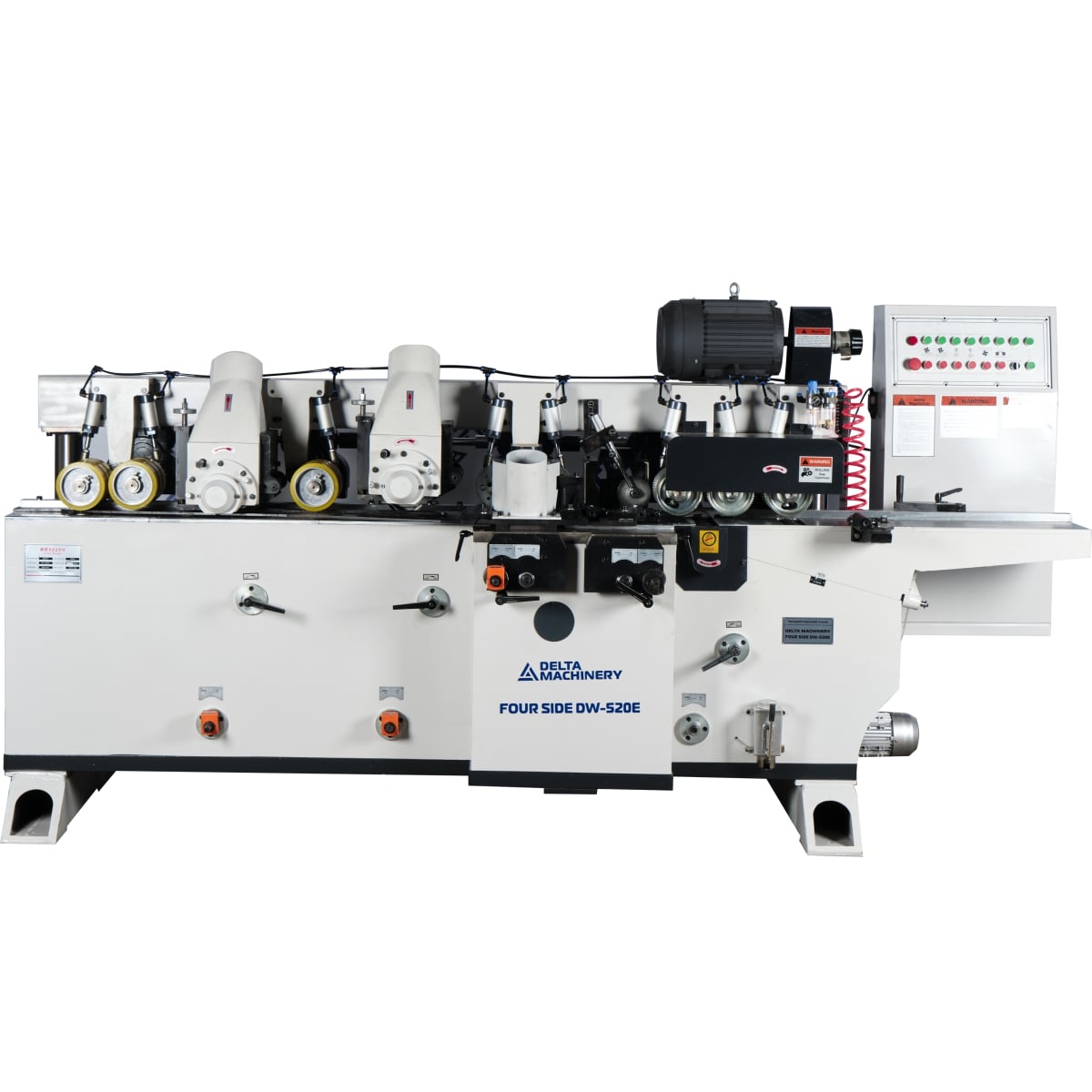 Четырёхсторонний станок DELTAMACHINERY FOUR SIDE DW-520H  (5 шпинделей) предназначен для высокоточной четырехсторонней обработки деревянной заготовки с целью получения высококачественных изделий за один проход. После обработки на 4-х сторонних станках отпадает необходимость в последующем шлифовании профилированных и строганных поверхностей.