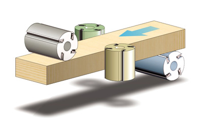 Механизм подачи состоит из верхних и нижних стальных роликов. Рифленые ролики на входе и обрезиненные на выходе, приводятся в движение системой карданных приводов и редукторов. Рифленые ролики обеспечивают стабильную подачу, а обрезиненные ролики на выходе не оставят никаких следов даже на самых мягких породах древесины.