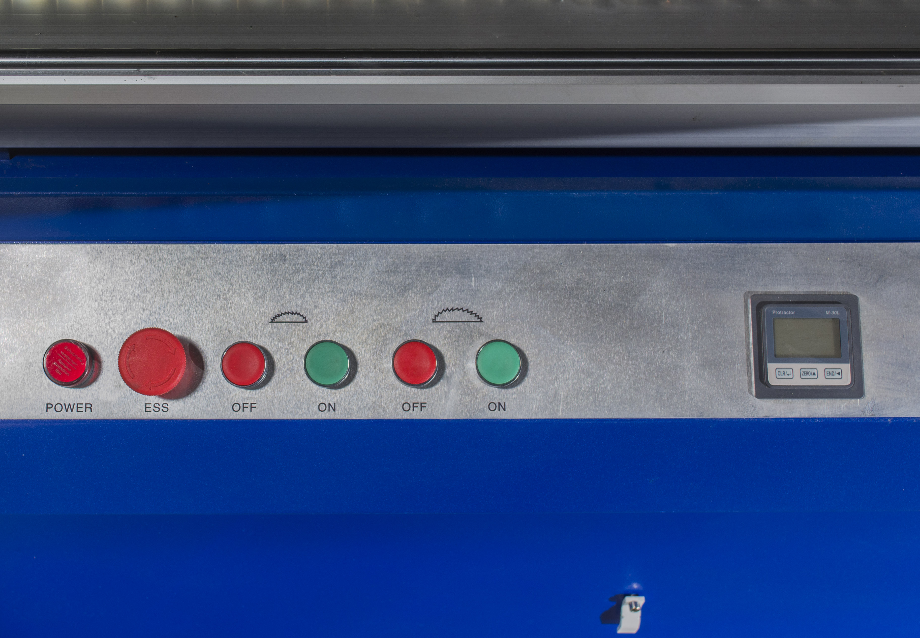 Эргономичный пульт управления оснащен цифровой индикацией угла наклона пильного узла, кнопками «пуск» / «стоп» основной и подрезной пилы, кнопкой «аварийный стоп» и лампой-индикатором работы станка.