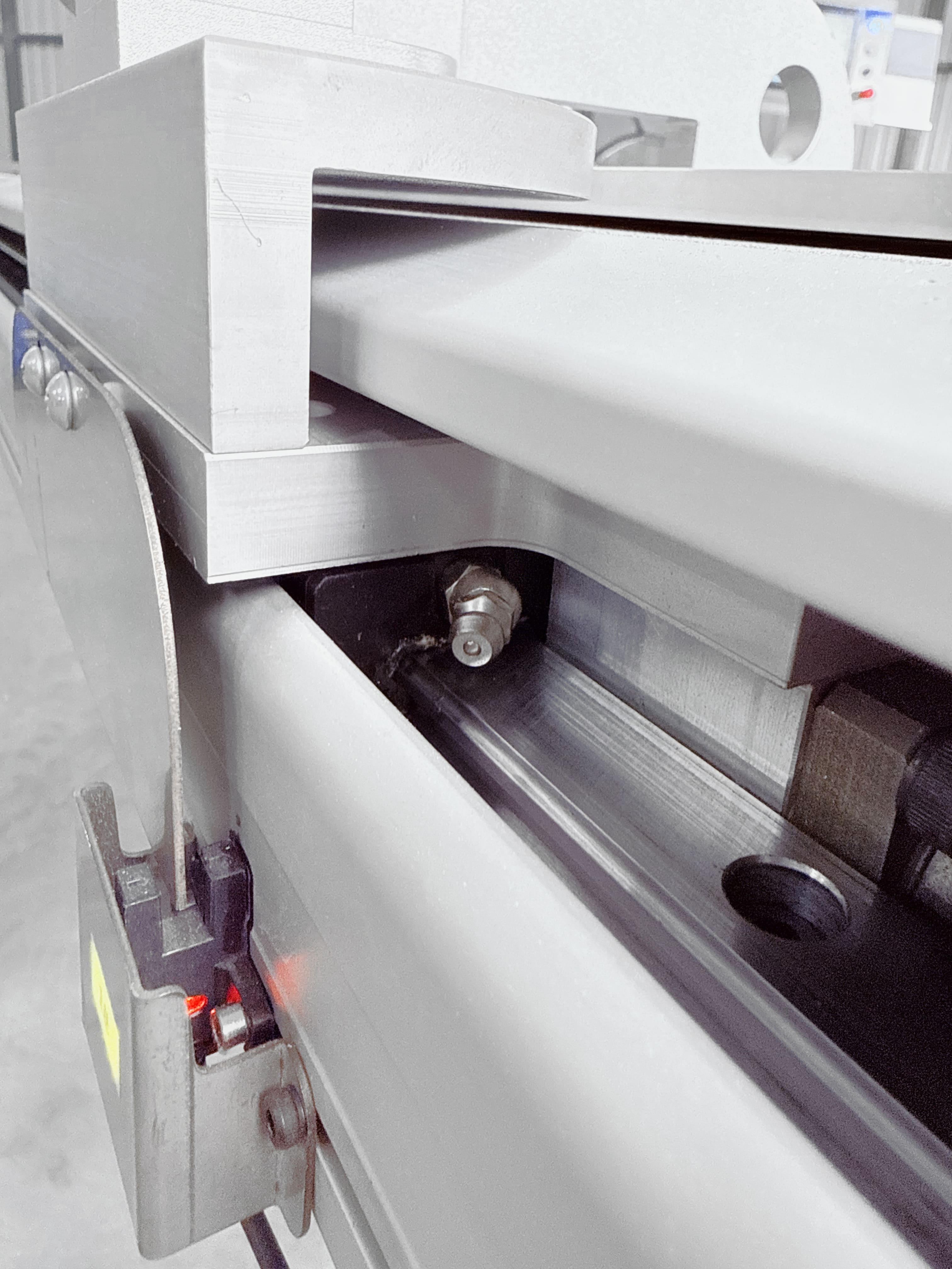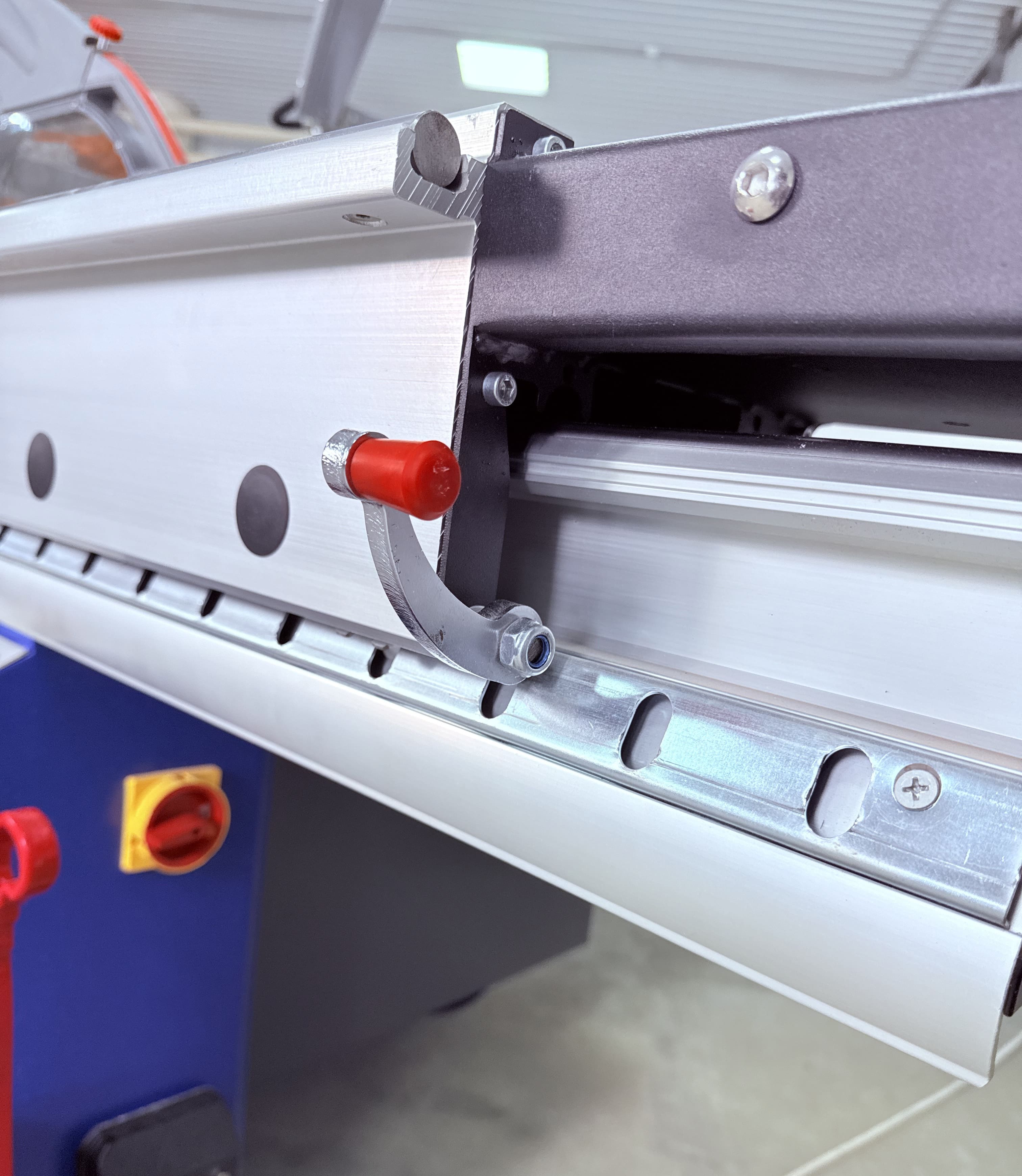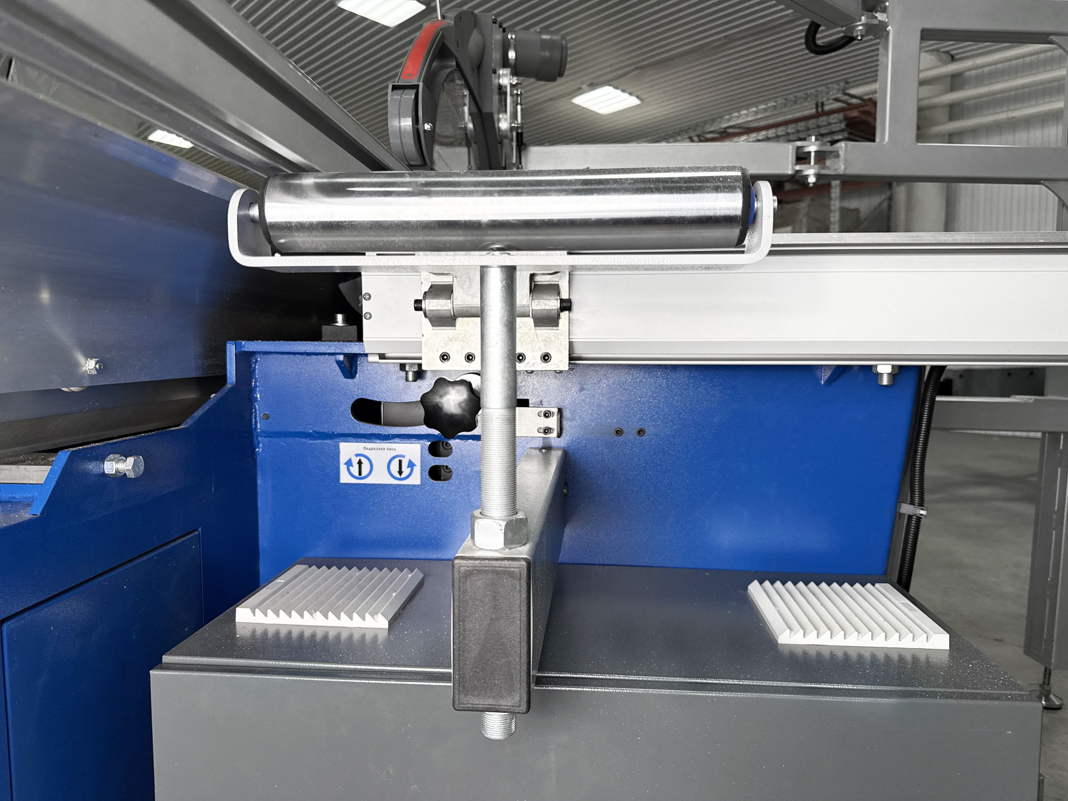 Перемещение перекидного упора осуществляется с помощью линейного подшипника на призматической направляющей, данная система крепления придает конструкции безупречную плавность хода, жесткость и как следствие отсутствие люфтов, что гарантированно обеспечивает точное позиционирование.