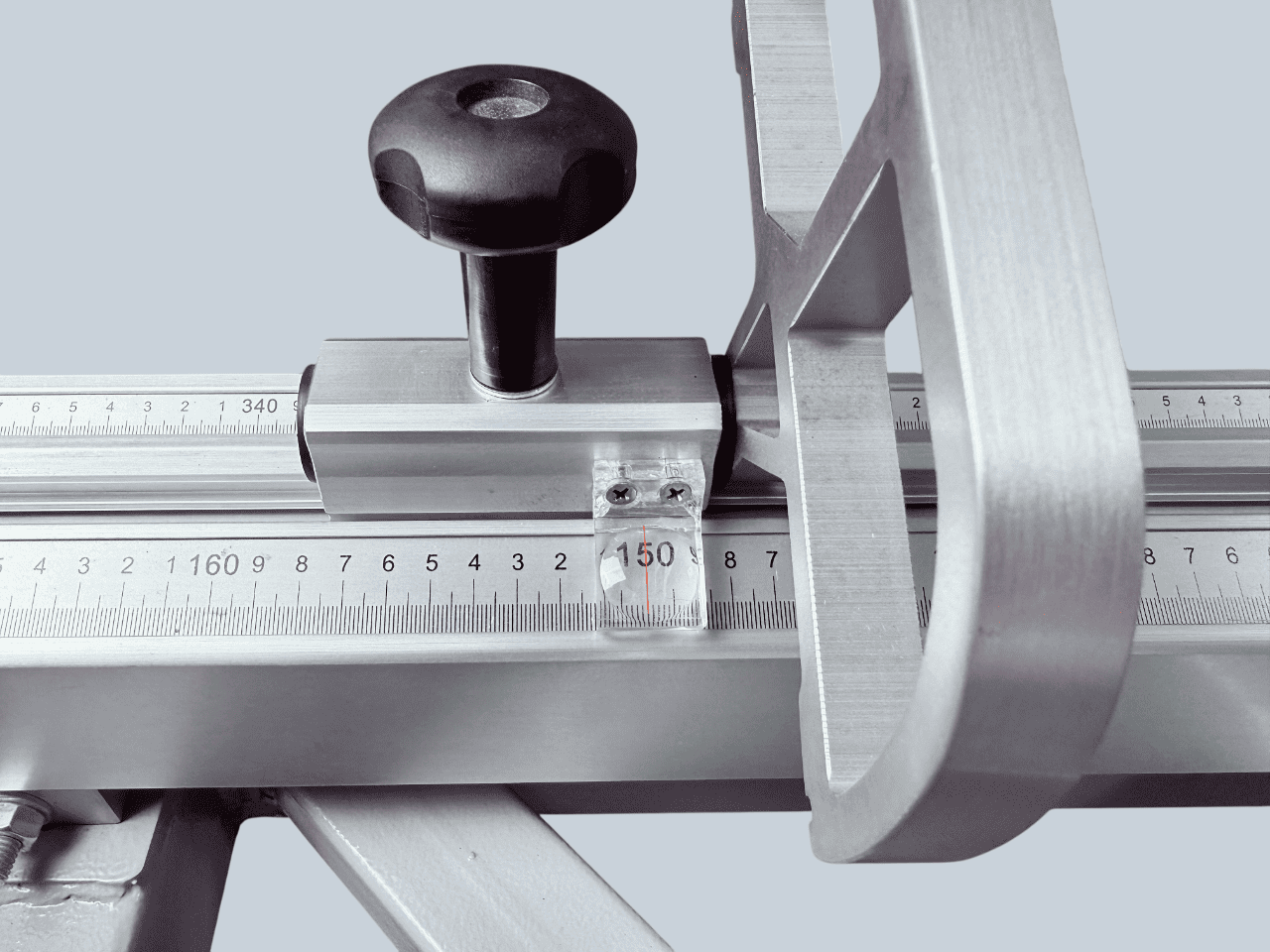 Поперечная линейка станка жестко фиксируется к поддерживающему столу в двух точках под углом 90 градусов к линии пропила. Настраивается единожды и не требует дополнительных регулировок. Это исключает смещение линейки во время работы и гарантирует правильную геометрию раскроя.