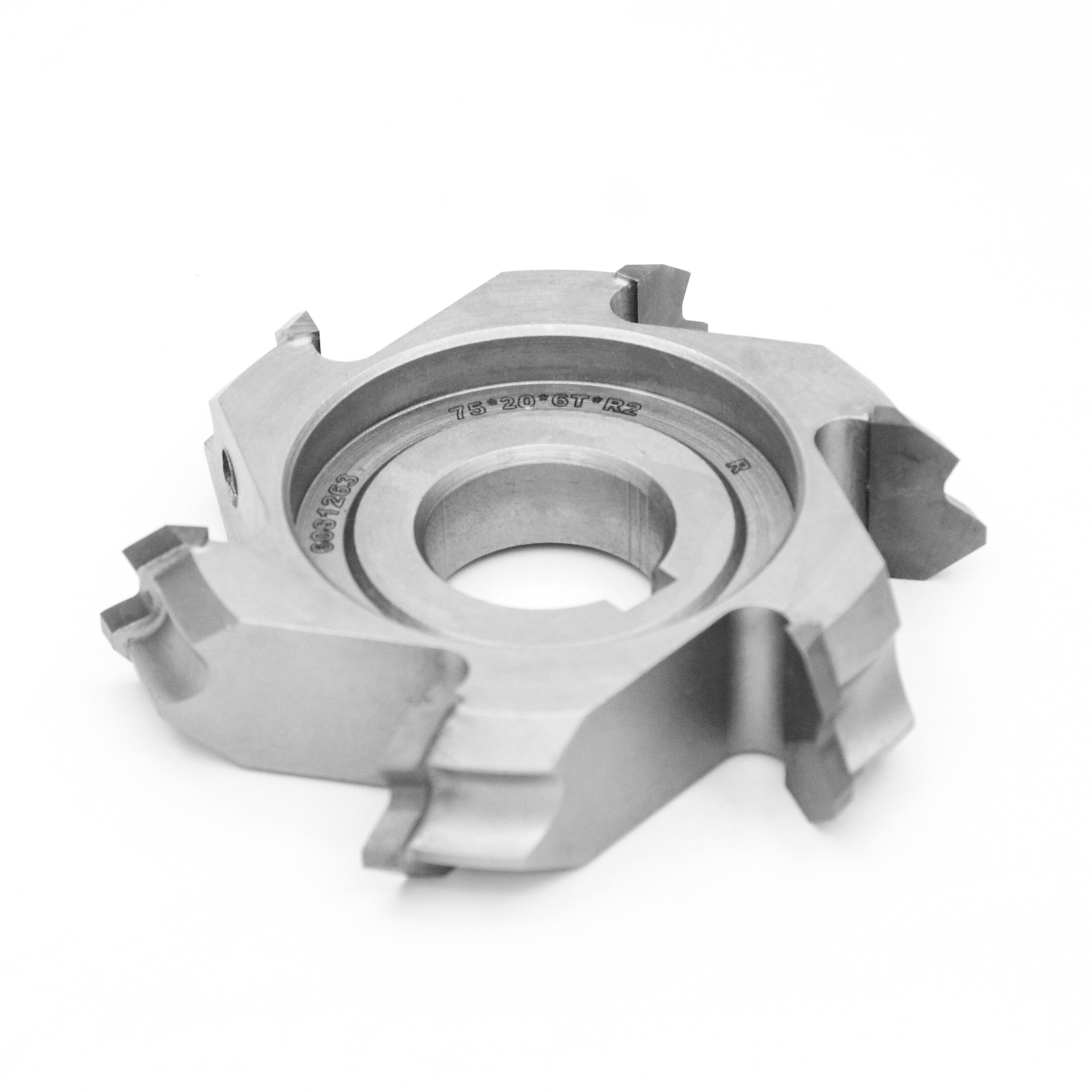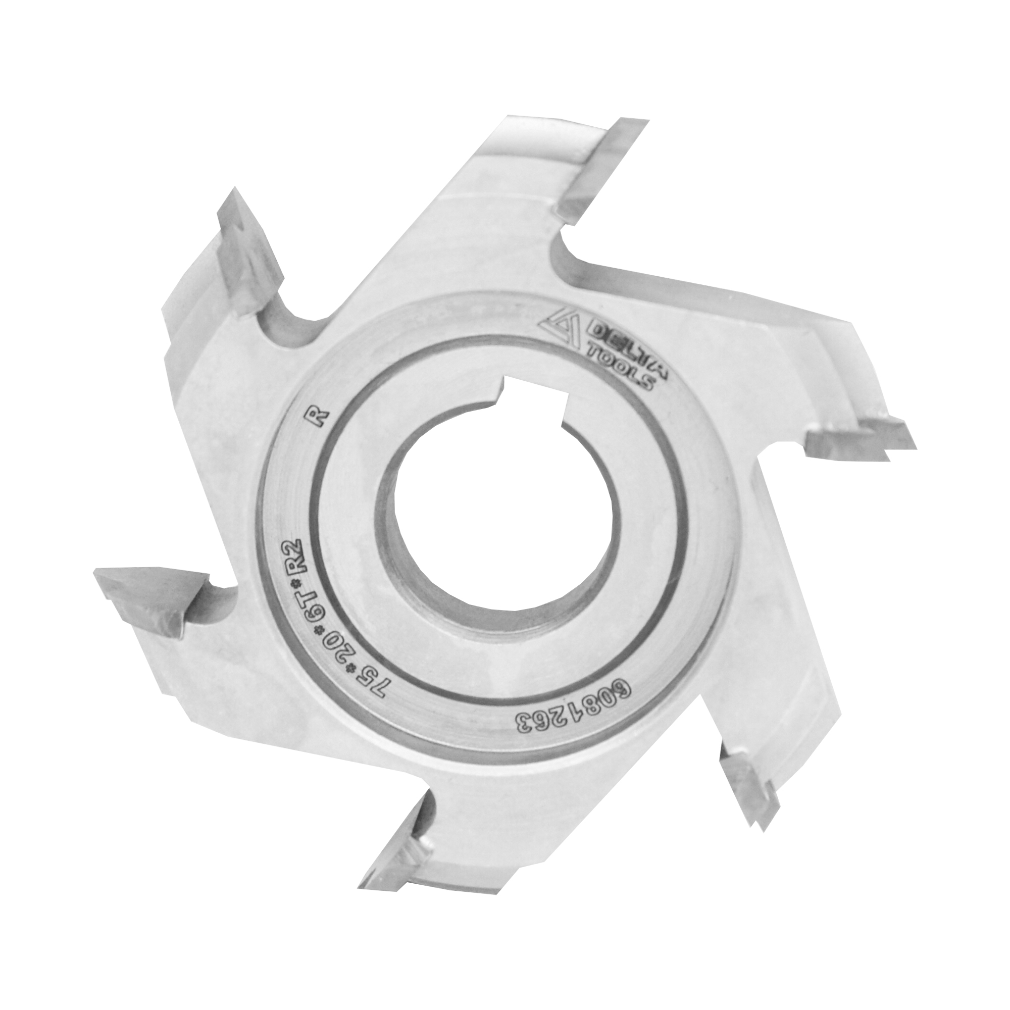 Фреза DELTA TOOLS 75x20x16 R2 Z6 R для снятия свесов применяется для форматирования и фугования поверхности плитных заготовок на узлах предварительного фрезерования кромкооблицовочных станков.