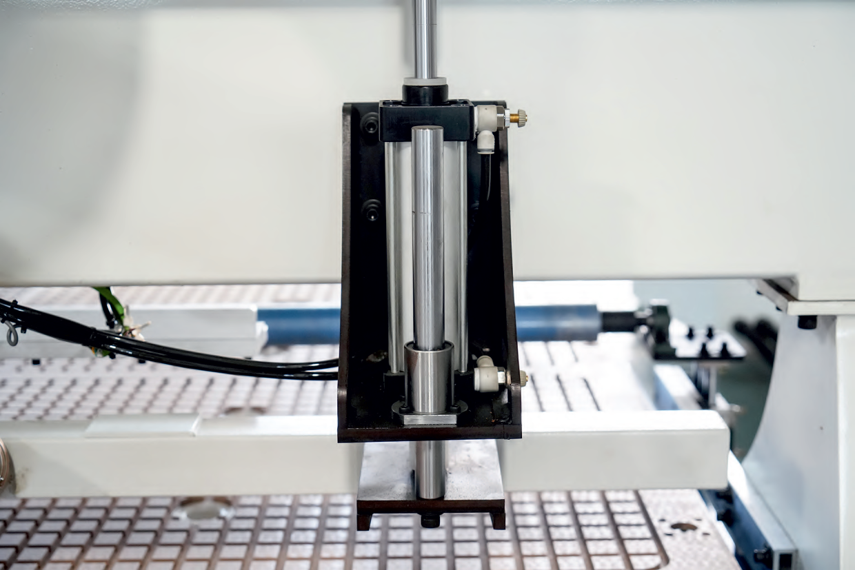 Станок оснащен пневматическими упорами для точного и быстрого позиционирования детали.