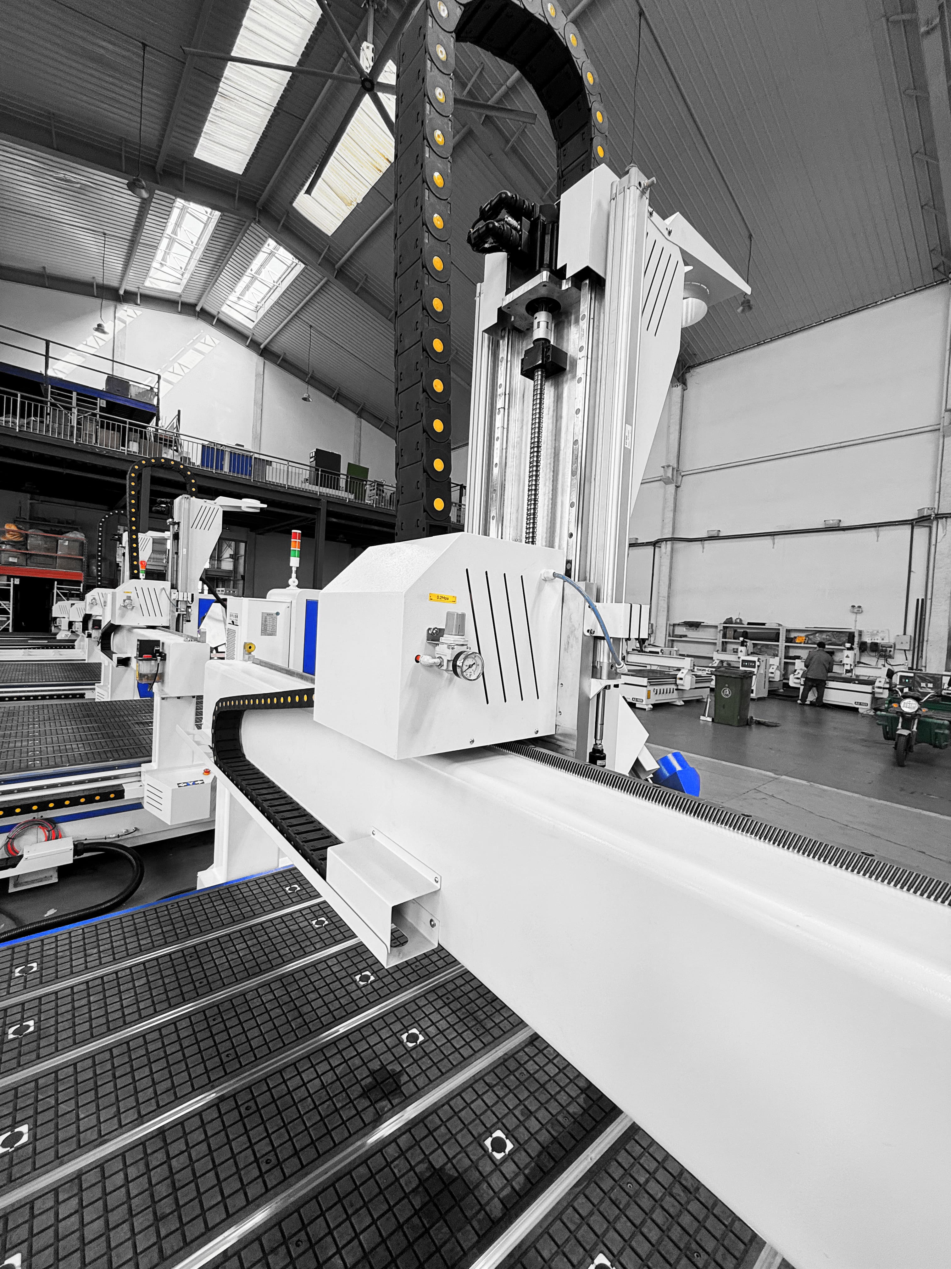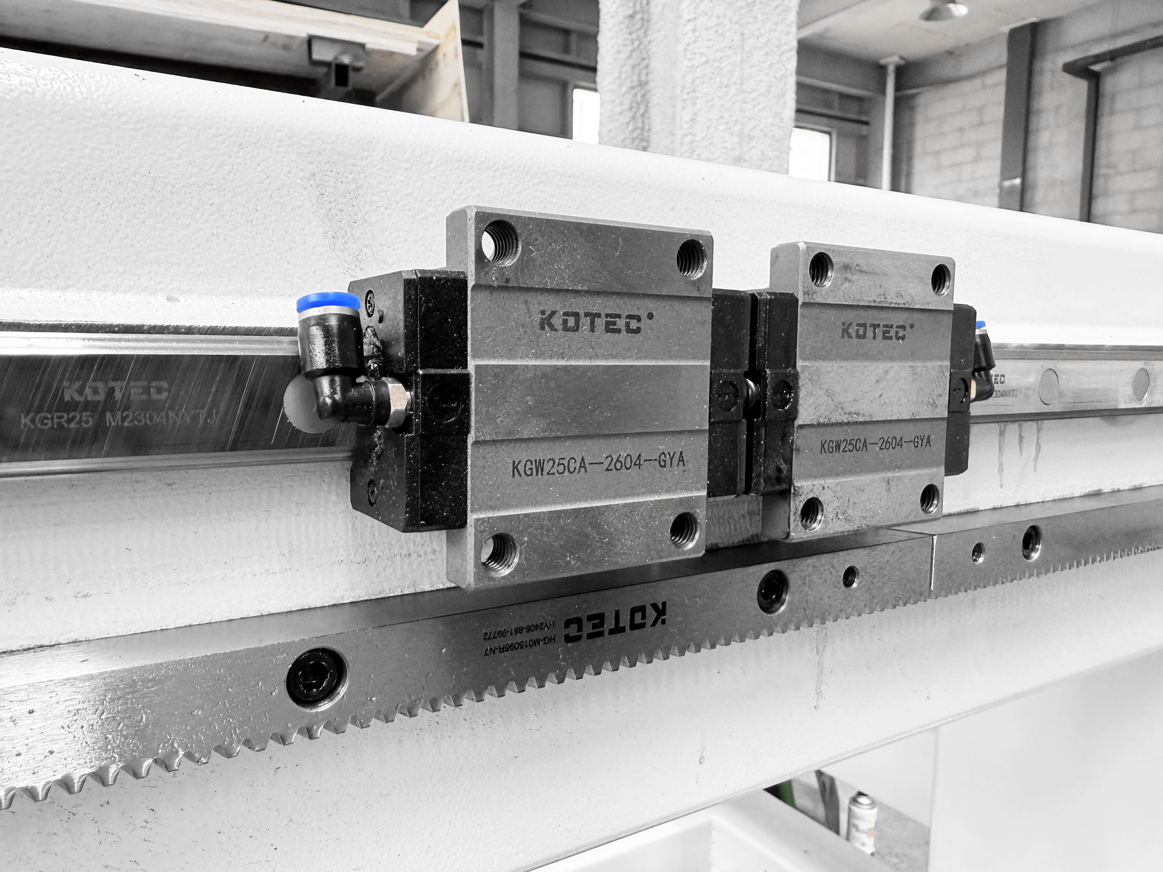 Станок оснащен высокоточными линейными направляющими и подшипниками 25 мм и косозубыми рейками и шестернями от компании KOTEC.