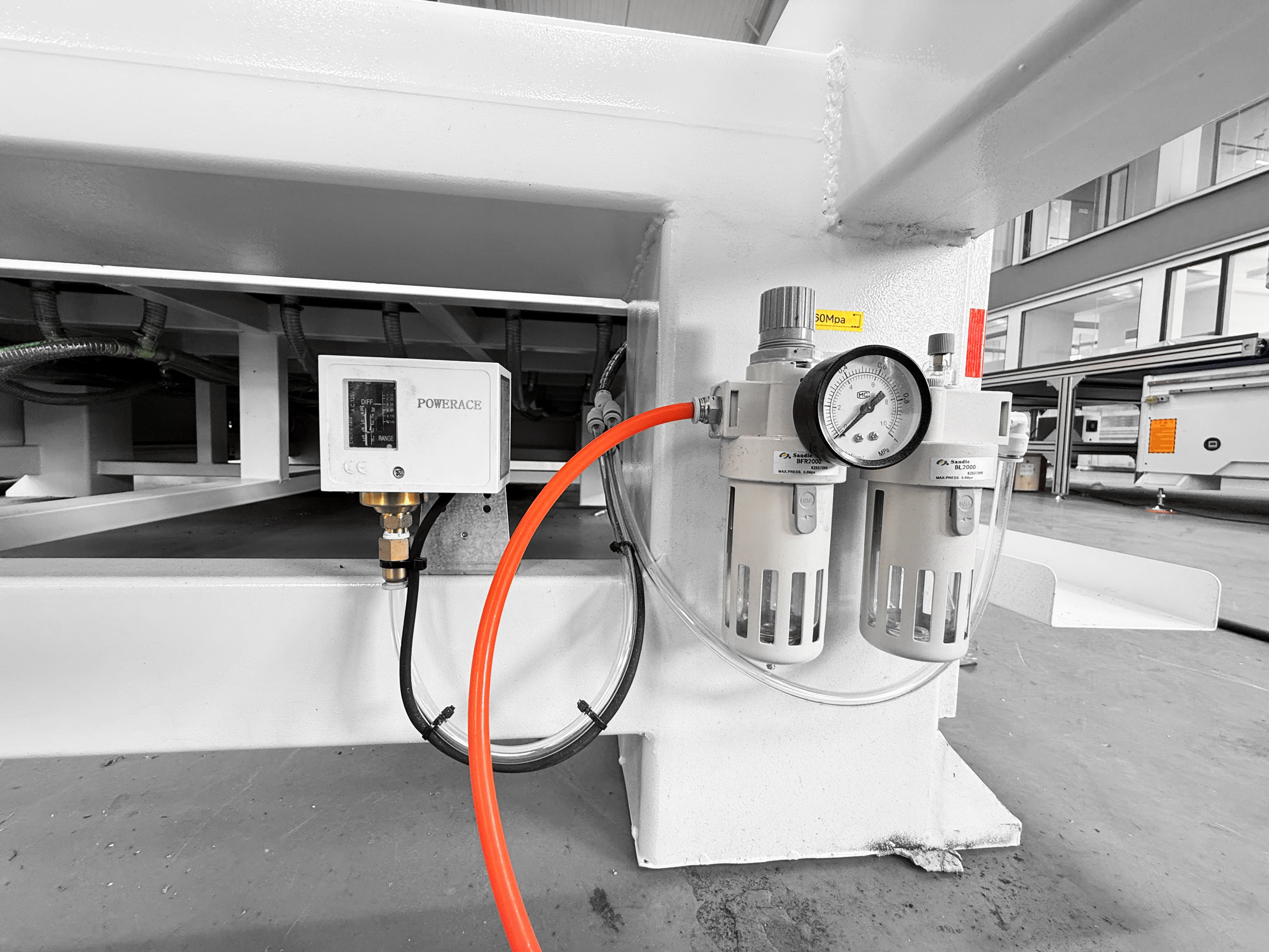 В состав блока подготовки воздуха входит лубрикатор для подачи смазочного материала в пневмосистему, влагоотделитель с продуваемой колбой и реле контроля давления в пневматический системе, позволяющее отключить станок при внезапной просадке давления в пневмосистеме, тем самым помогает избежать аварийных и нештатных ситуаций.