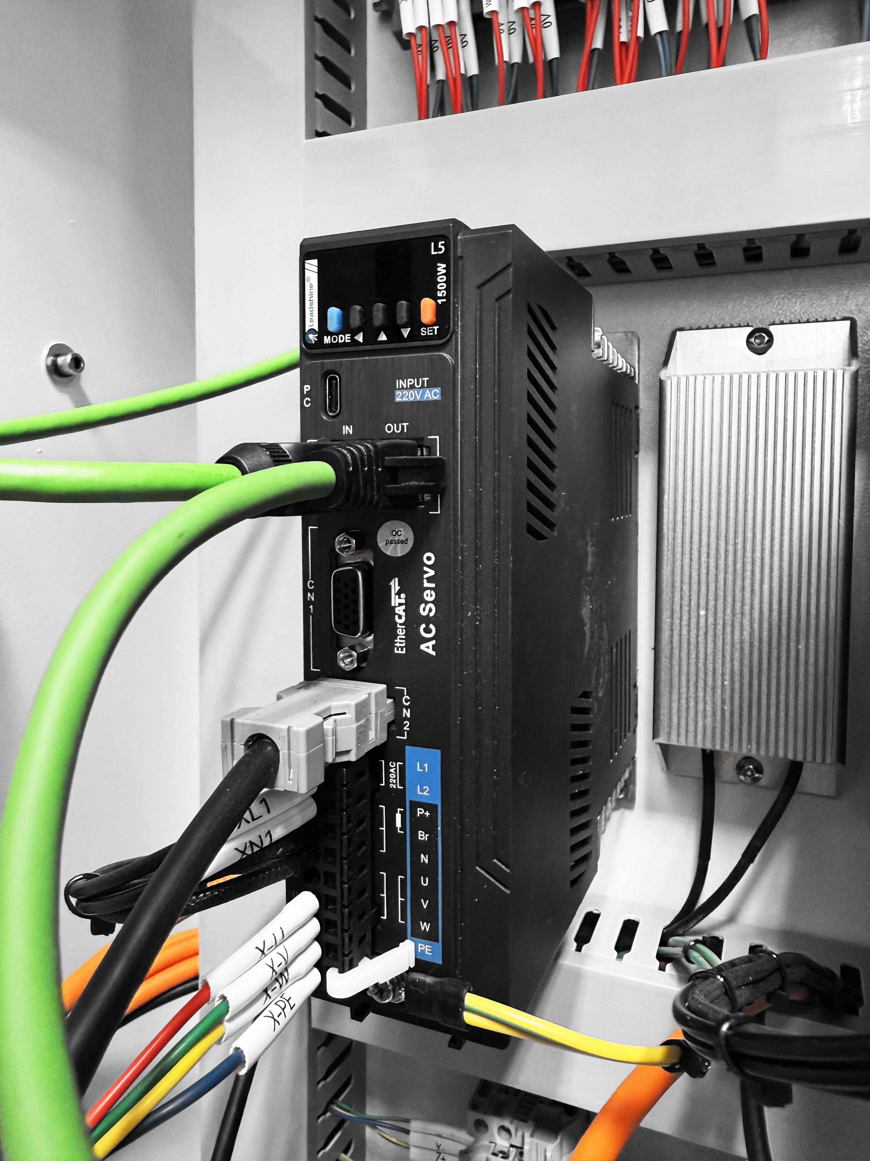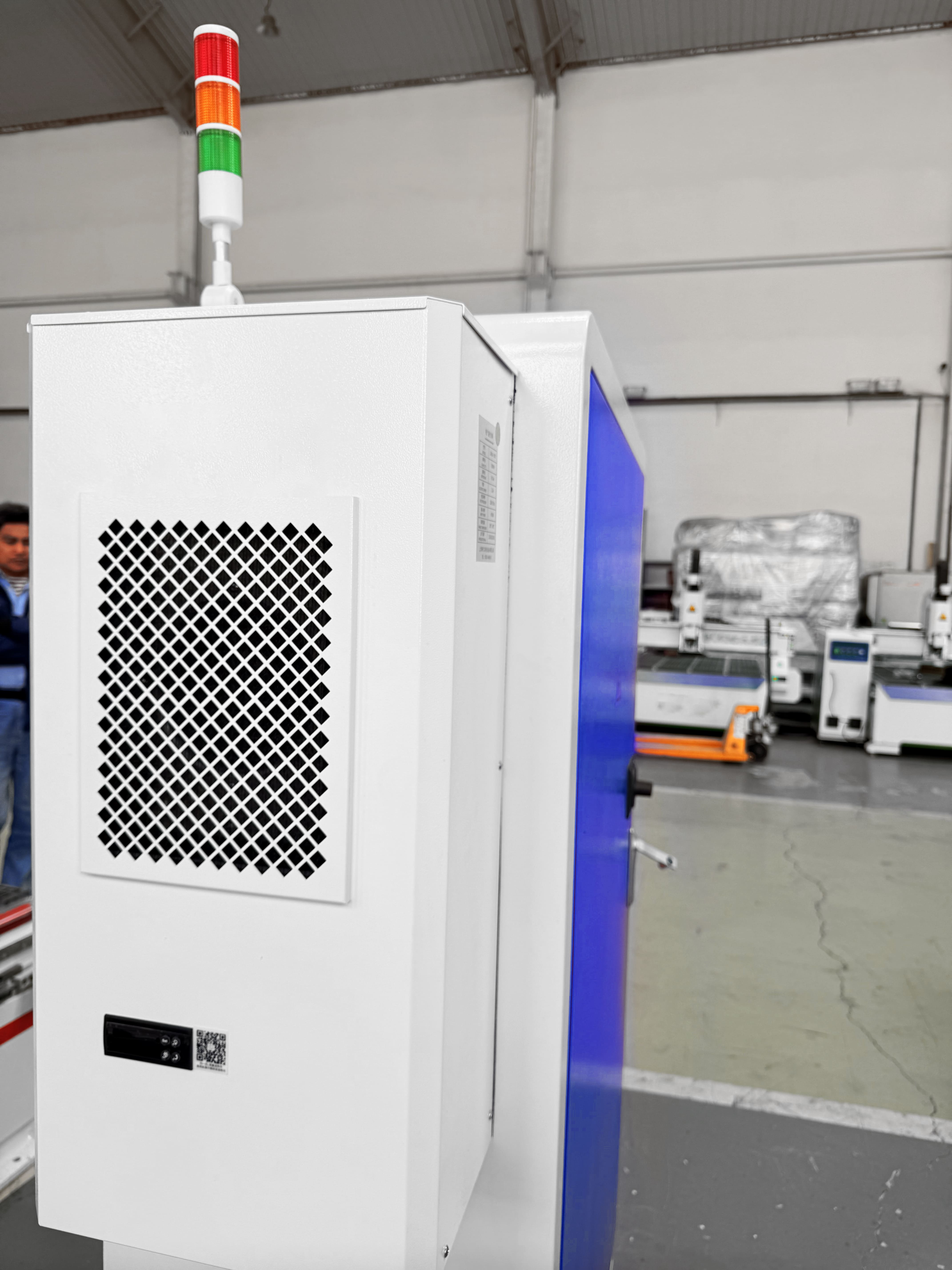 Шкаф управления выполнен в пылезащищенном исполнении и оснащен системой кондиционирования с воздушным фильтром. Кондиционер с температурным датчиком расположен на задней части электроблока. Такое решение позволяет создать идеальную температуру для работы контроллеров, инверторов, драйверов и систем управления, защищает их от перегрева даже при самом интенсивном графике работы и позволяет в разы увеличить ресурс электронных компонентов.