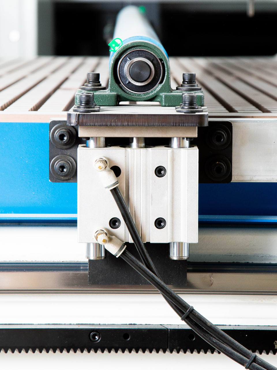 Станок оснащен пневматическими упорами для точного и быстрого позиционирования детали.
