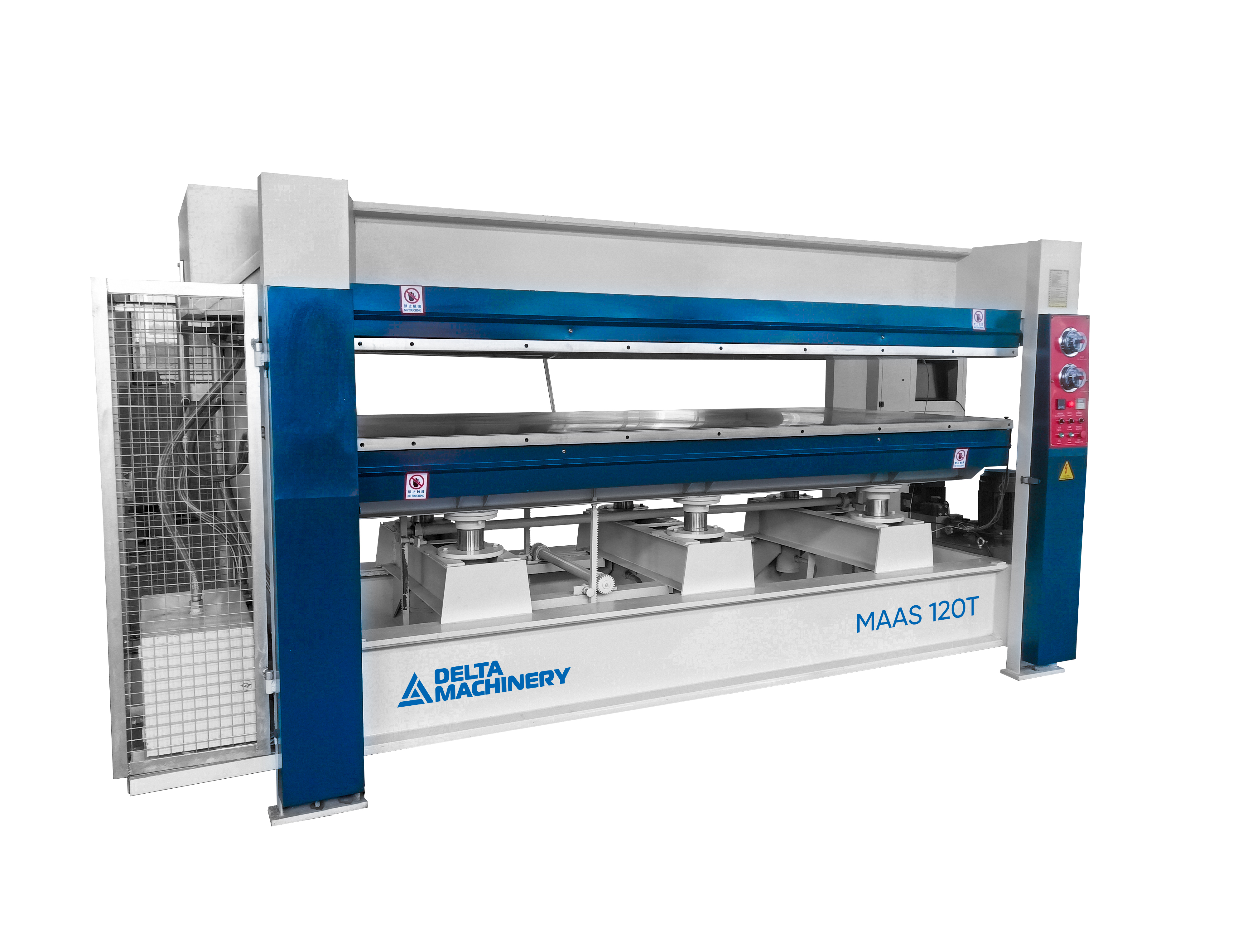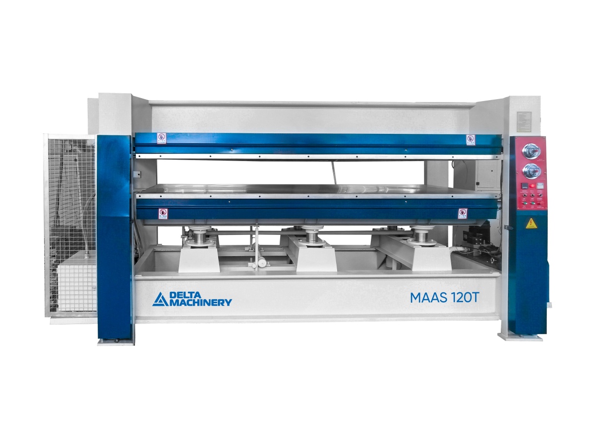 Горячий пресс Двухпролетный (с подвижной нижней плитой, с электрическим нагревателем для масла) предназначен для двухстороннего облицовывания ровных поверхностей ДСП, МДФ, ДВП, фанеры, столярной плиты, щитов из массива древесины при помощи различных клеевых материалов различными облицовочными материалами: натуральный шпон ценных пород древесины, пленка ПВХ, пластик при максимальной рабочей температуре 120 °С.