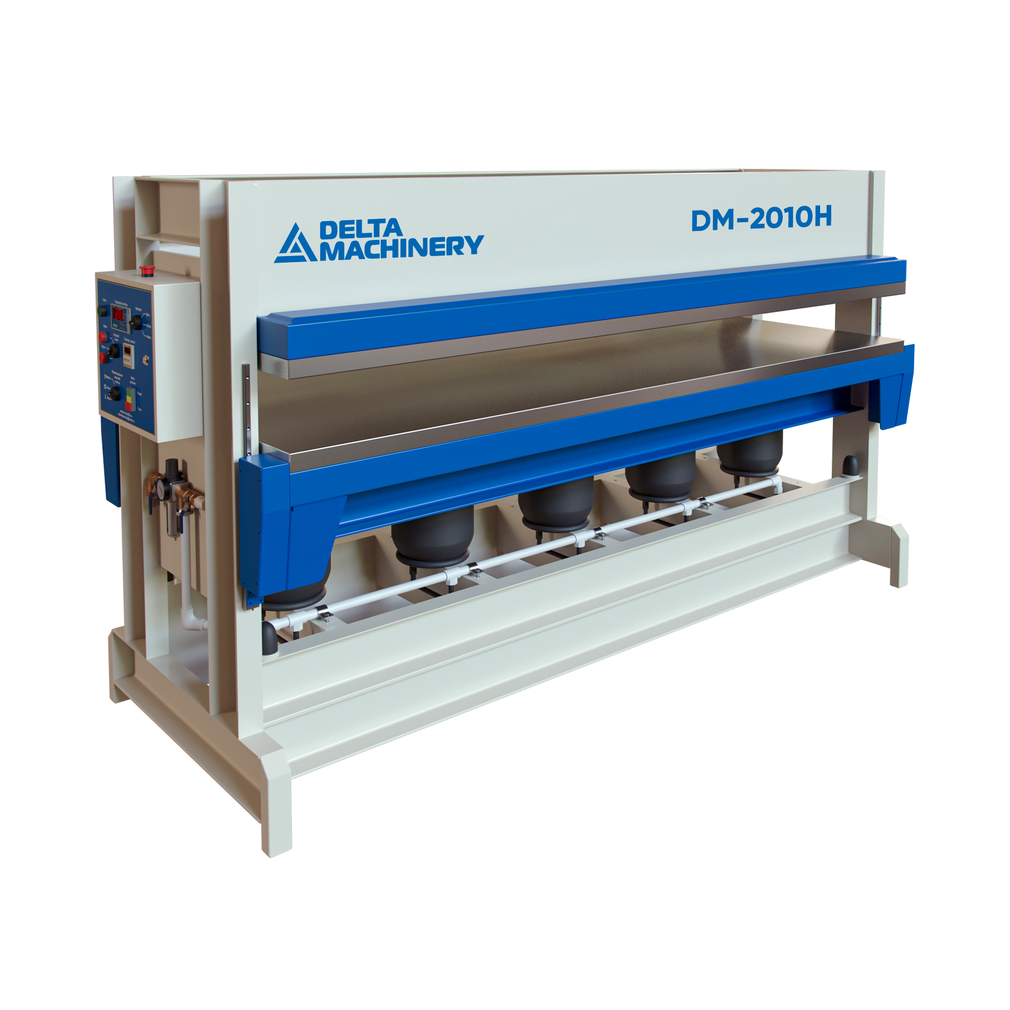 Пресс пневматический горячего прессования 2010 – предназначен для склеивания под температурой (max 100 C) плоских заготовок в пачке, для облицовывания плоских заготовок с одной или двух сторон шпоном, различными пластиками и пленками, а также для стеновых панелей и композитных материалов.