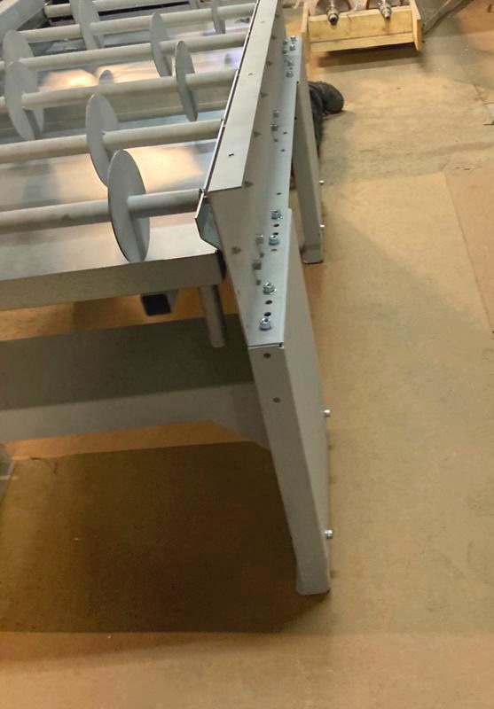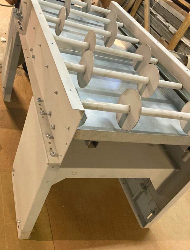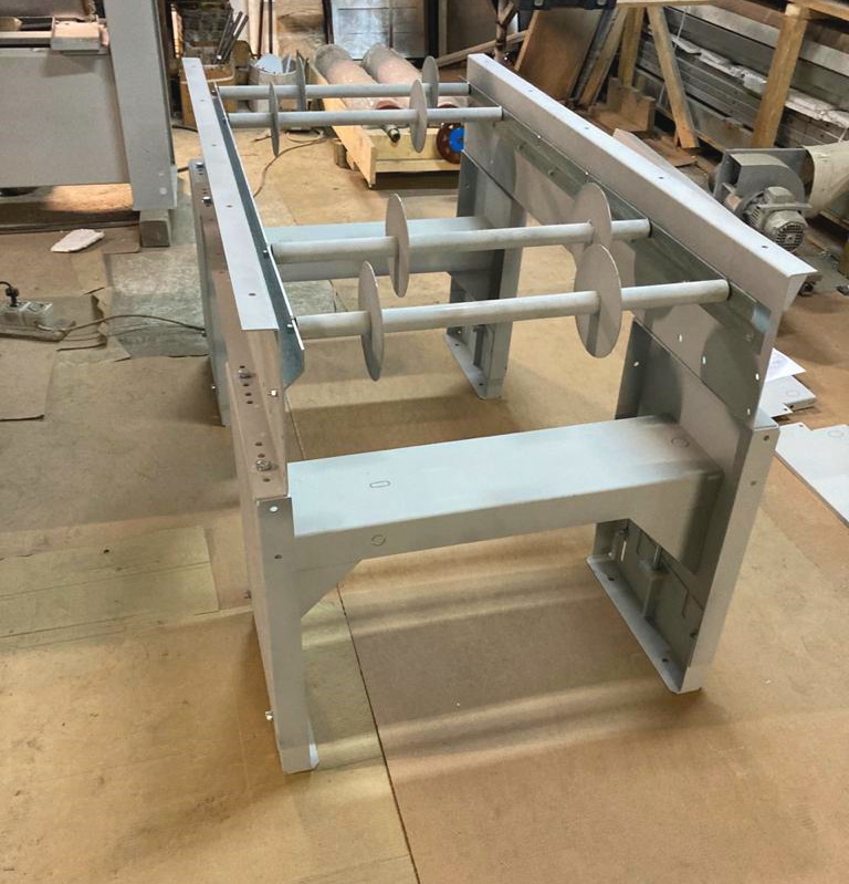 Исполнен из гнутого листового материала разной толщины. Регулируемая высота конвейера с помощью разработанного механизма регулировки.