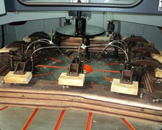 При обработке ножек стульев шаблоны расставляются по краю круглого стола, прижим каждой заготовки осуществляется с помощью 2-х или 3-х пневмоприжимов. При обработке столешниц и сидений стульев используется пневмоприжим находящийся над центром стола, пневмоприжимы для ножек при этом снимаются.