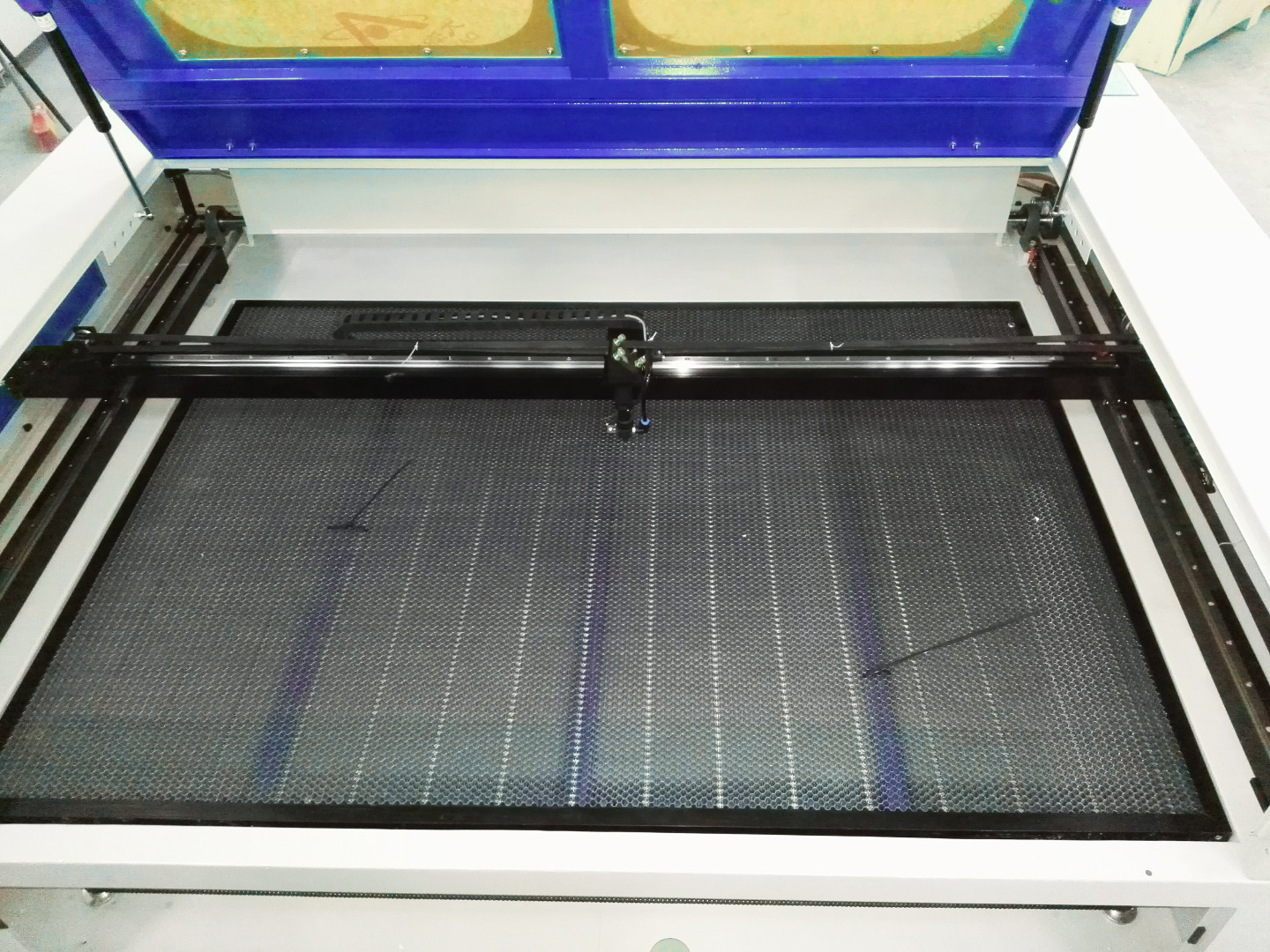 Ячеистый рабочий стол размером 1400х100 мм. Перемещение лазерной головки производится за счет шаговых двигателей посредством ременной передачи.