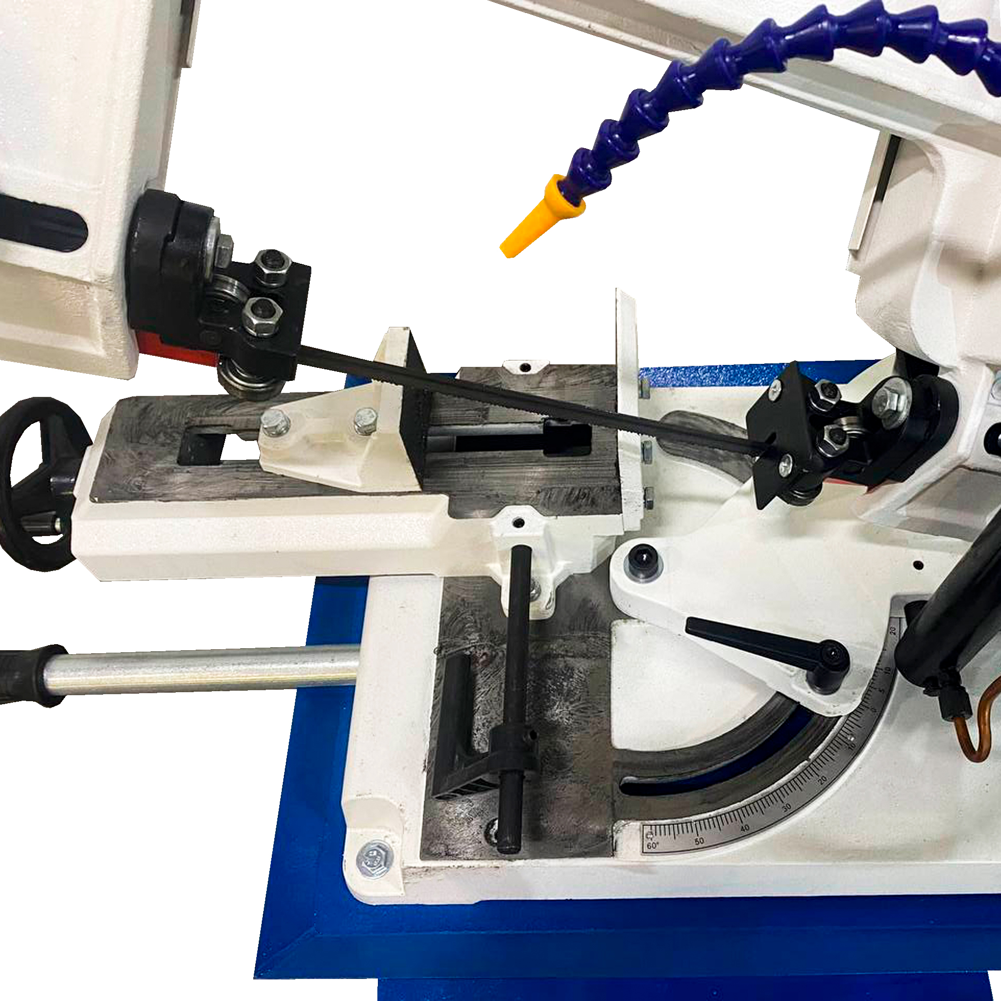 В комплектацию станка включается система подачи СОЖ (Смазочно-охлаждающая жидкость) и емкость, а также подвижный канал подачи смазки для удобства работы и корректного охлаждения заготовки и ленточнопильного полотна в процессе работы.