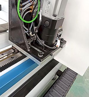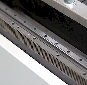 Для перемещения по осям Х и Y на станке используется шестерня и косозубая рейка. Это решение позволяет добиться высоких скоростных показателей без потери точности обработки.