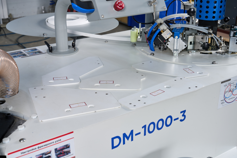 Двухсторонний фрезерный узел для снятия свесов оснащен высокооборотистыми моторами 24 000 об/мин, мощностью 800 Вт каждый. Фрезер оборудован копирами с микронастройкой по плоскости и приводным копиром с изменяемой скоростью подачи по торцу заготовки. В зону обработки нижней и верхней фрезы возможна подача разделительной жидкости с помощью форсунок расположенных на фрезерном узле.