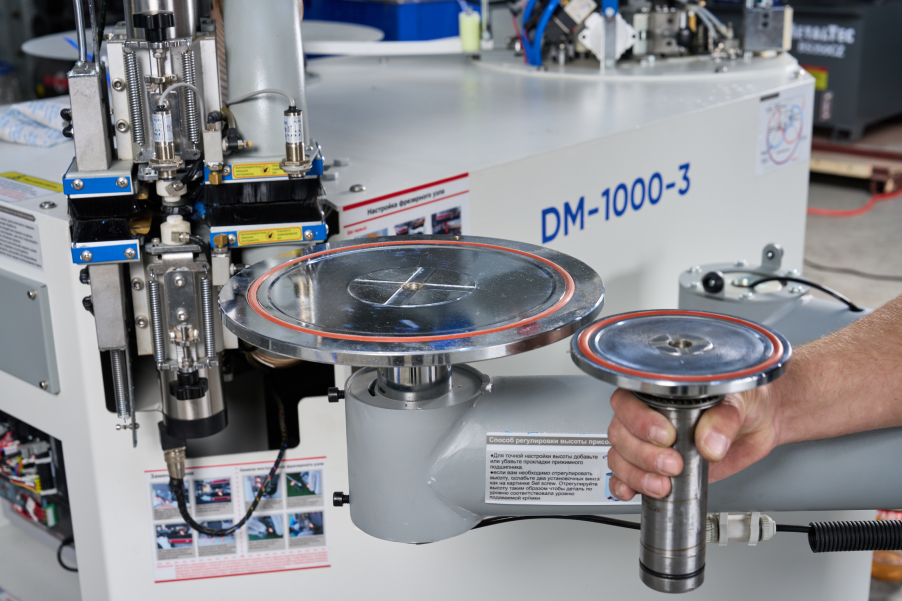 Надежная выдвижная консоль грузоподъемностью 100 кг, для перемещения детали в течении всего цикла обработки, с вакуумной фиксацией укомплектована двумя типами сменных насадок диаметром 300 мм и 140 мм, для удобства работы с различными типоразмерами деталей.