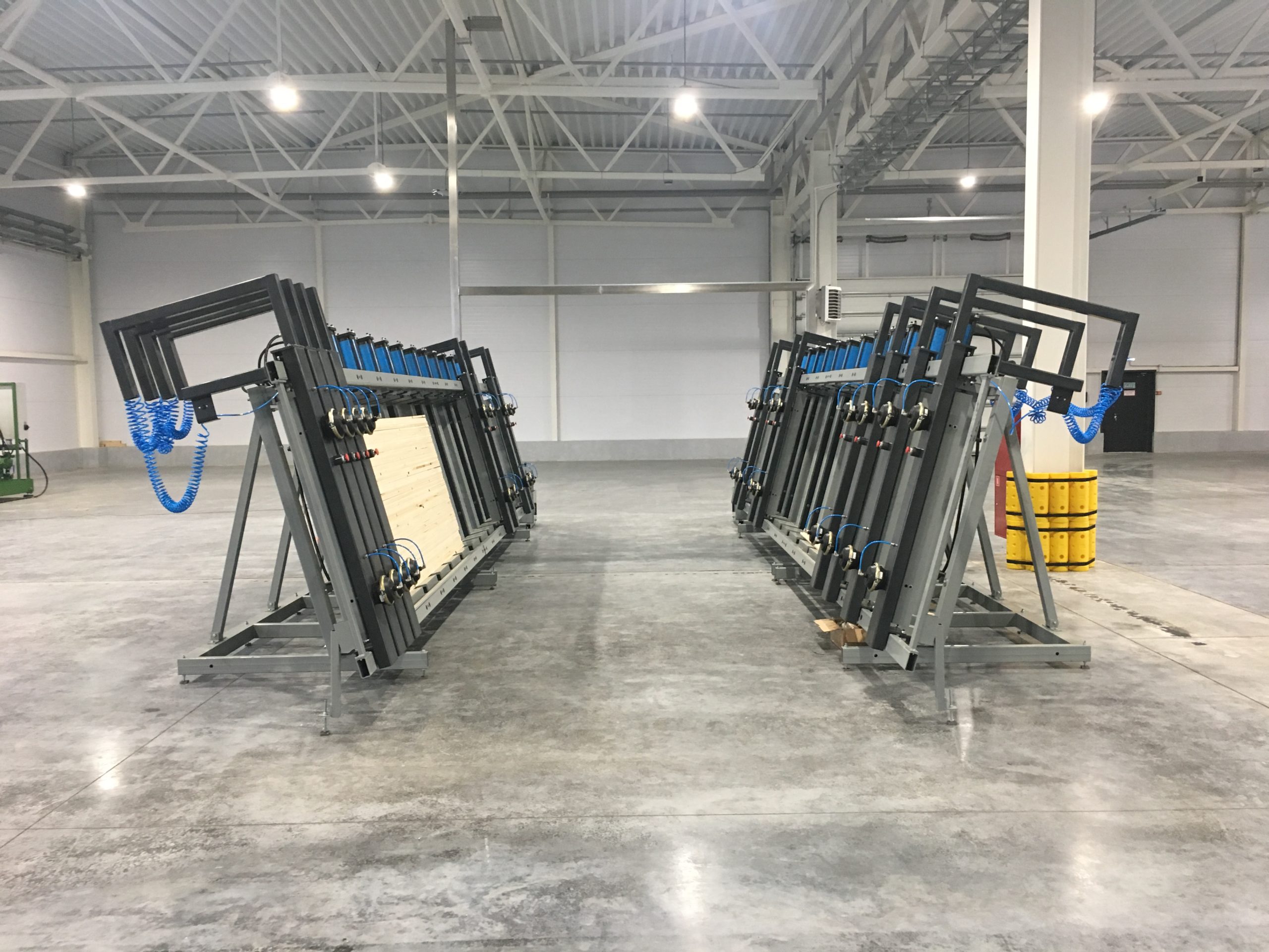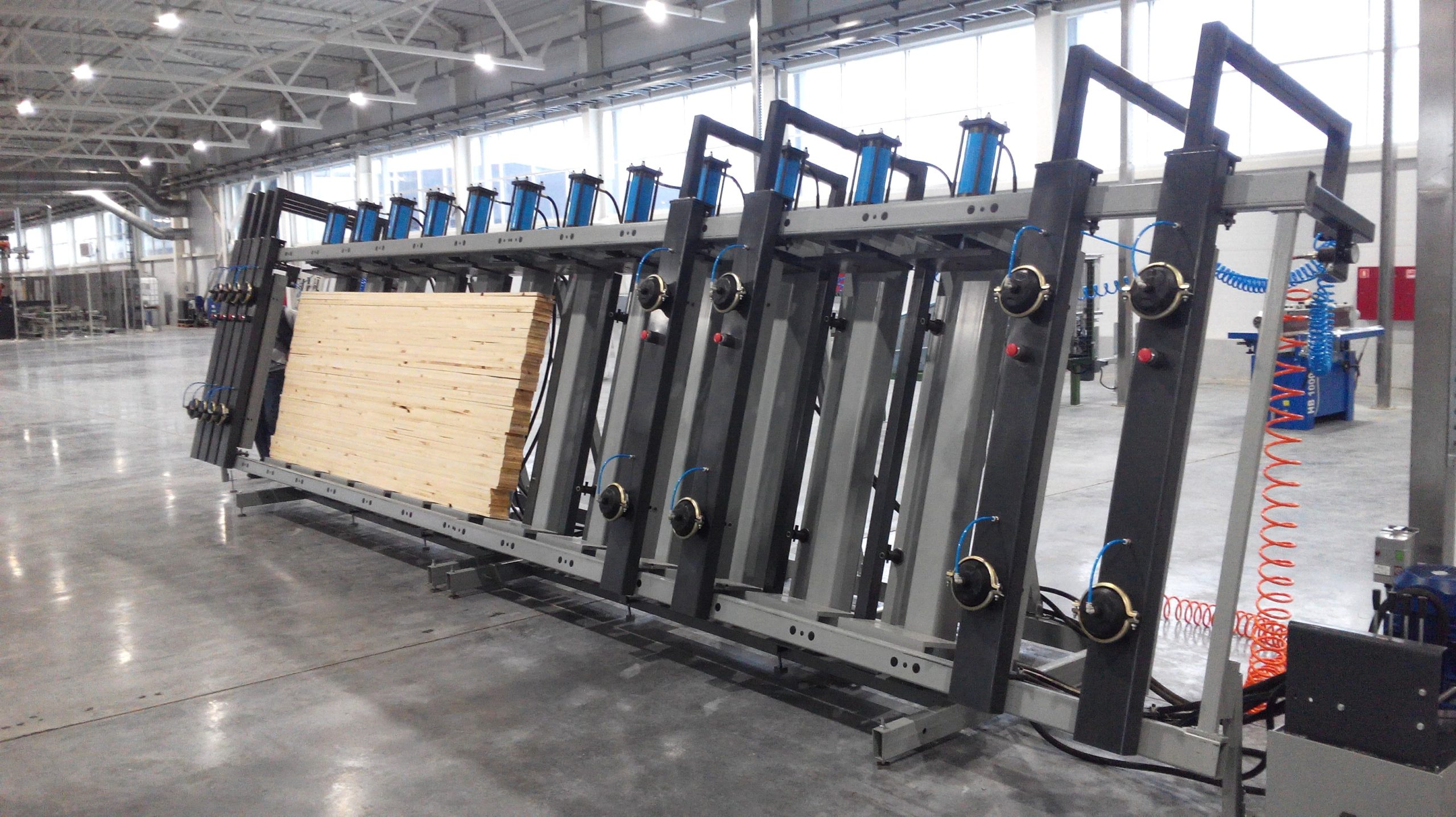 Вайма гидравлическая оснащена откатными пневматическими фронтальными прижимами. Их перемещение за пределы рабочей зоны обеспечивает свободный доступ при укладке и выгрузке. Откатные пневматические фронтальные прижимы гарантированно выравнивают и удерживают пакет заготовок во время прессования.