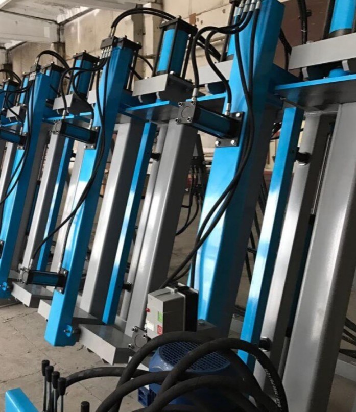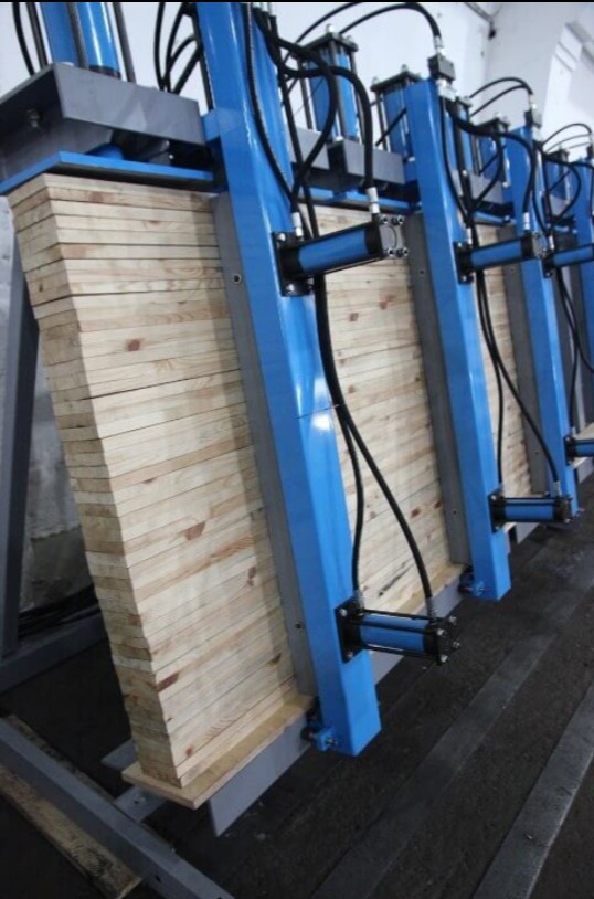 Оператор набирает пакет из заготовок с предварительно нанесенным клеем, далее устанавливает фронтальные прижимы. Процесс прессования начинается после включения оператором вертикальных гидроцилиндров работающих от установленного на пресс гидронасоса, обеспечивая тем самым равномерное распределение нагрузки на заготовки |