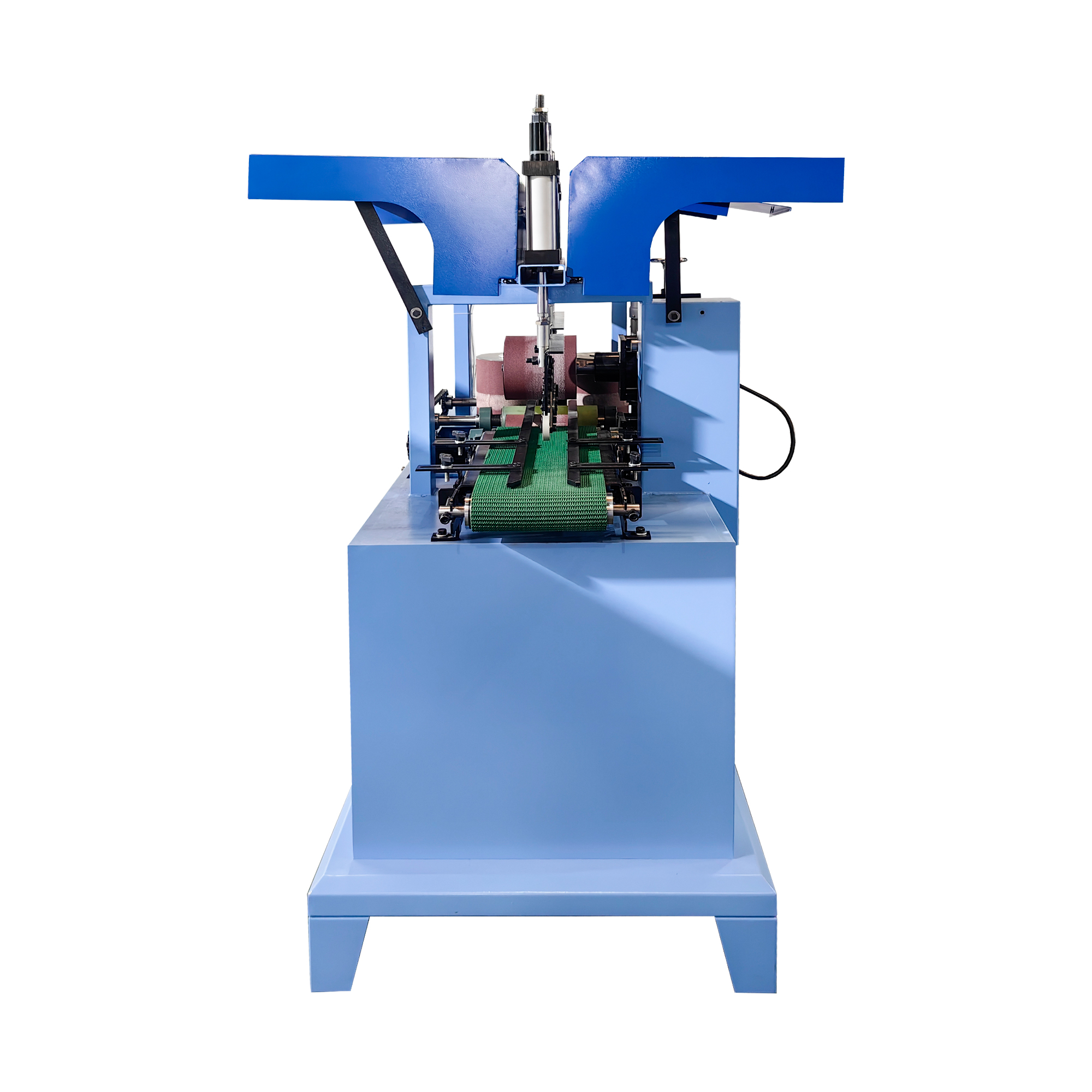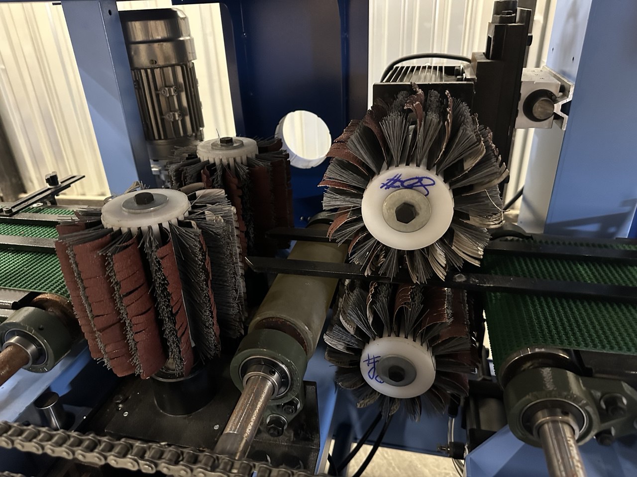 Станок в базовом исполнении оснащен щеточно-шлифовальными барабанами. При необходимости можно укомплектовать ленточно-шлифовальными барабанами (как на фото). Вне зависимости от вида шлифовальных барабанов они будут иметь функцию осцилляции, для более качественной обработки и экономии расходных шлифовальных элементов.