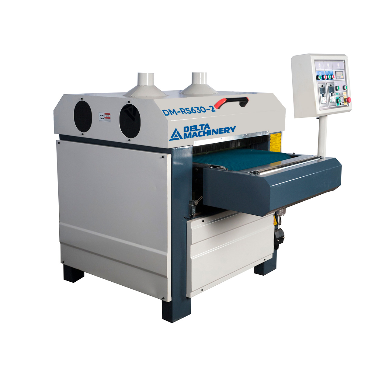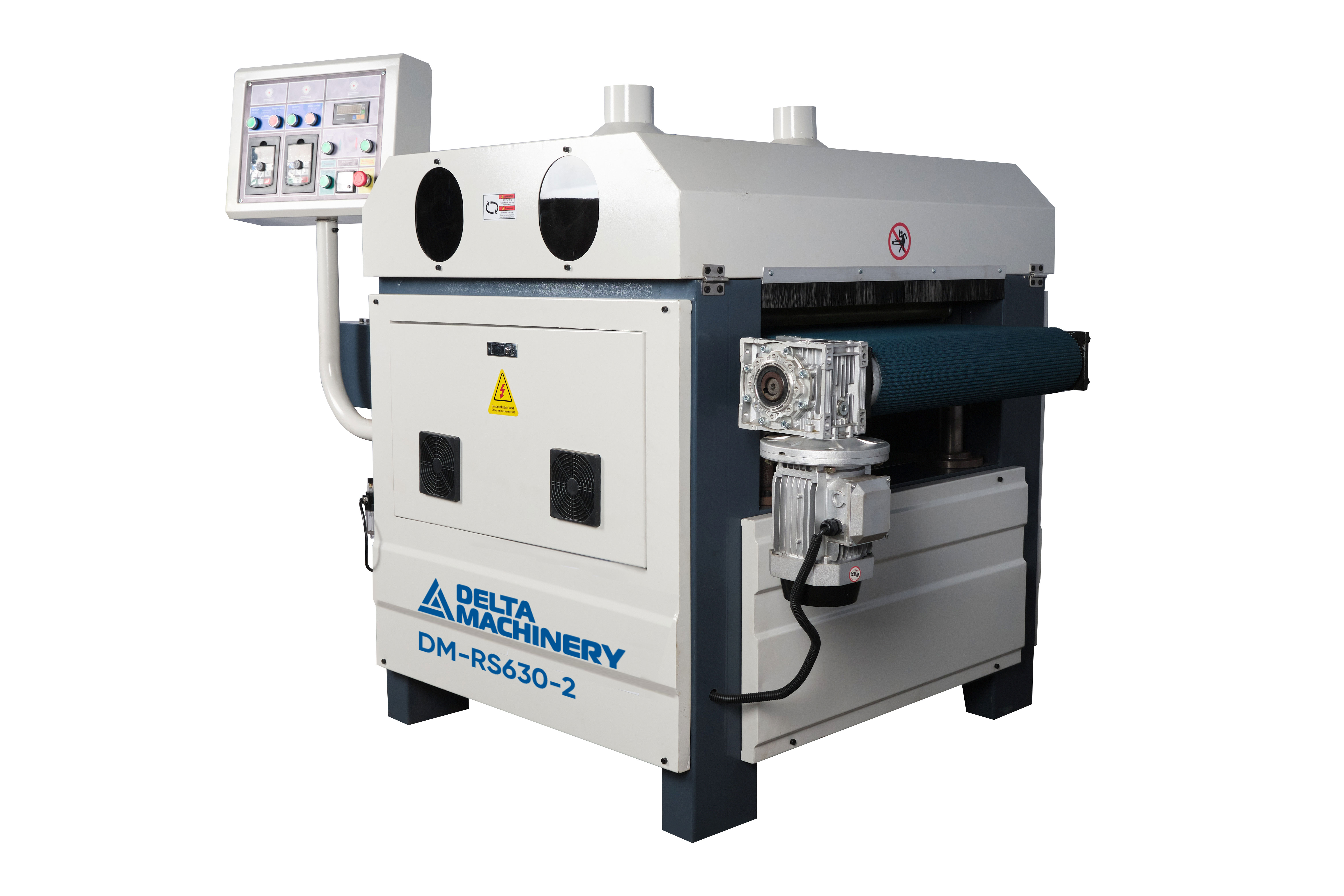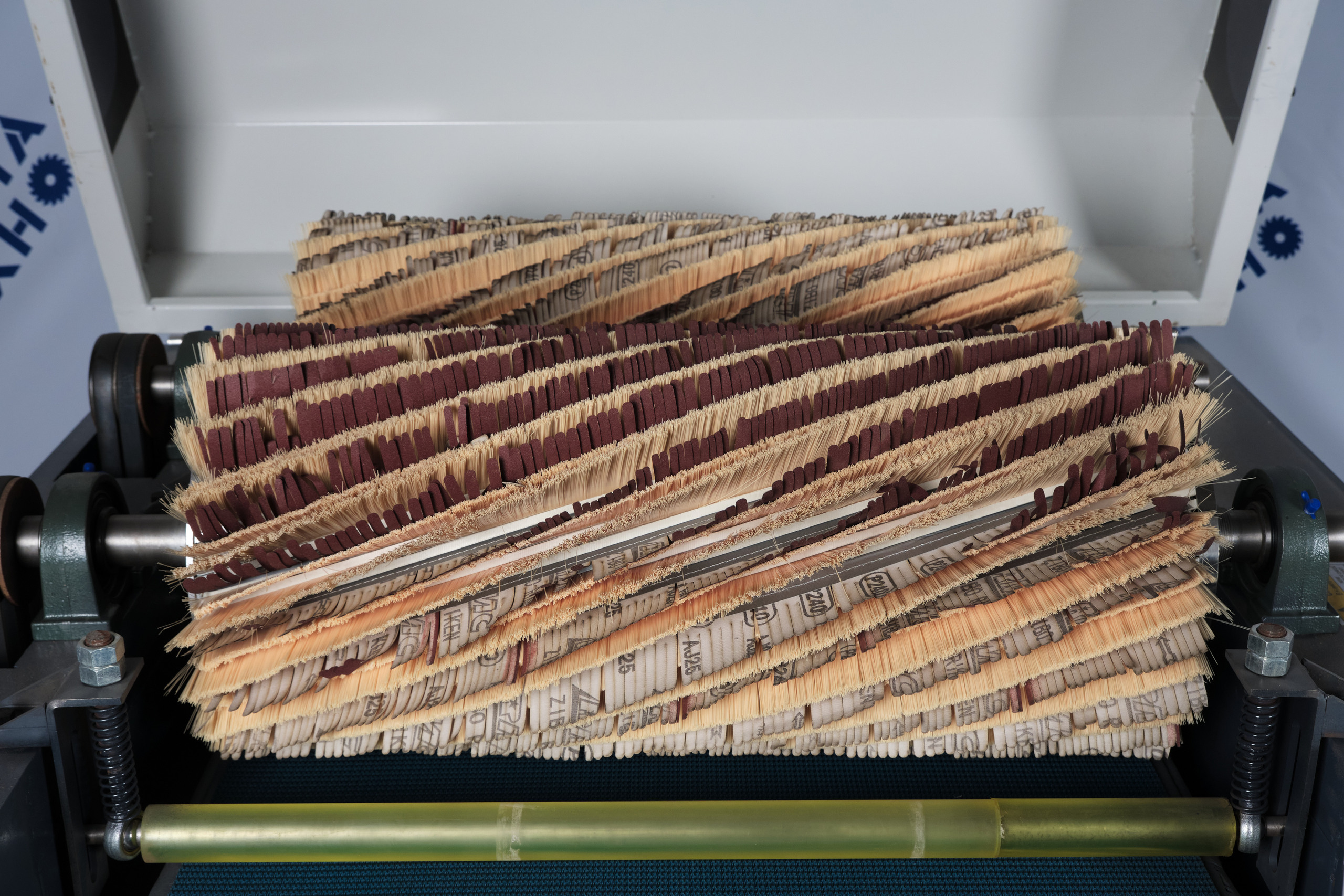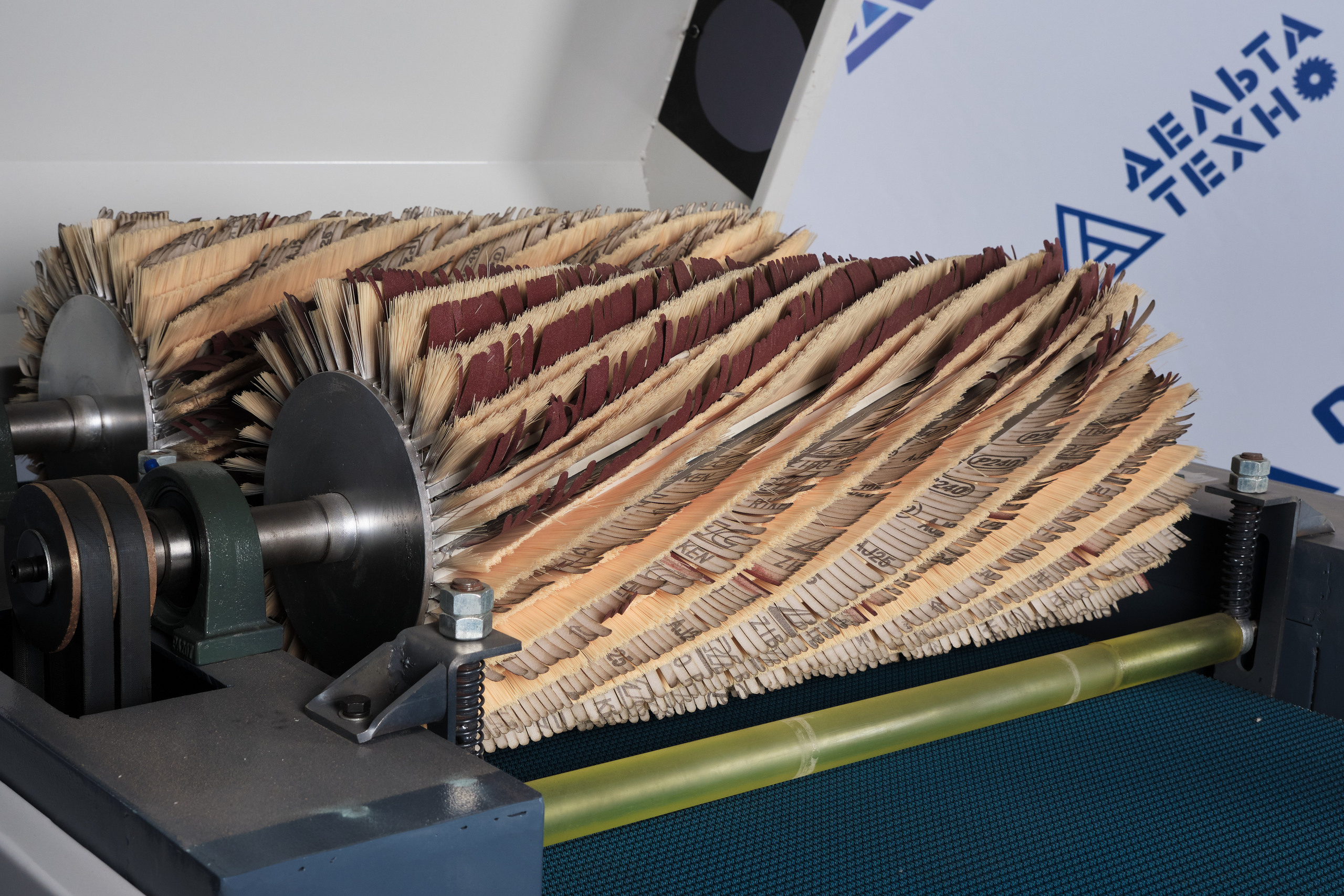 Заготовка обрабатывается двумя продольными шлифовальными блоками (два барабана во всю ширину рабочего стола, с щетками и абразивными вкладышами, расположенными по спирали)