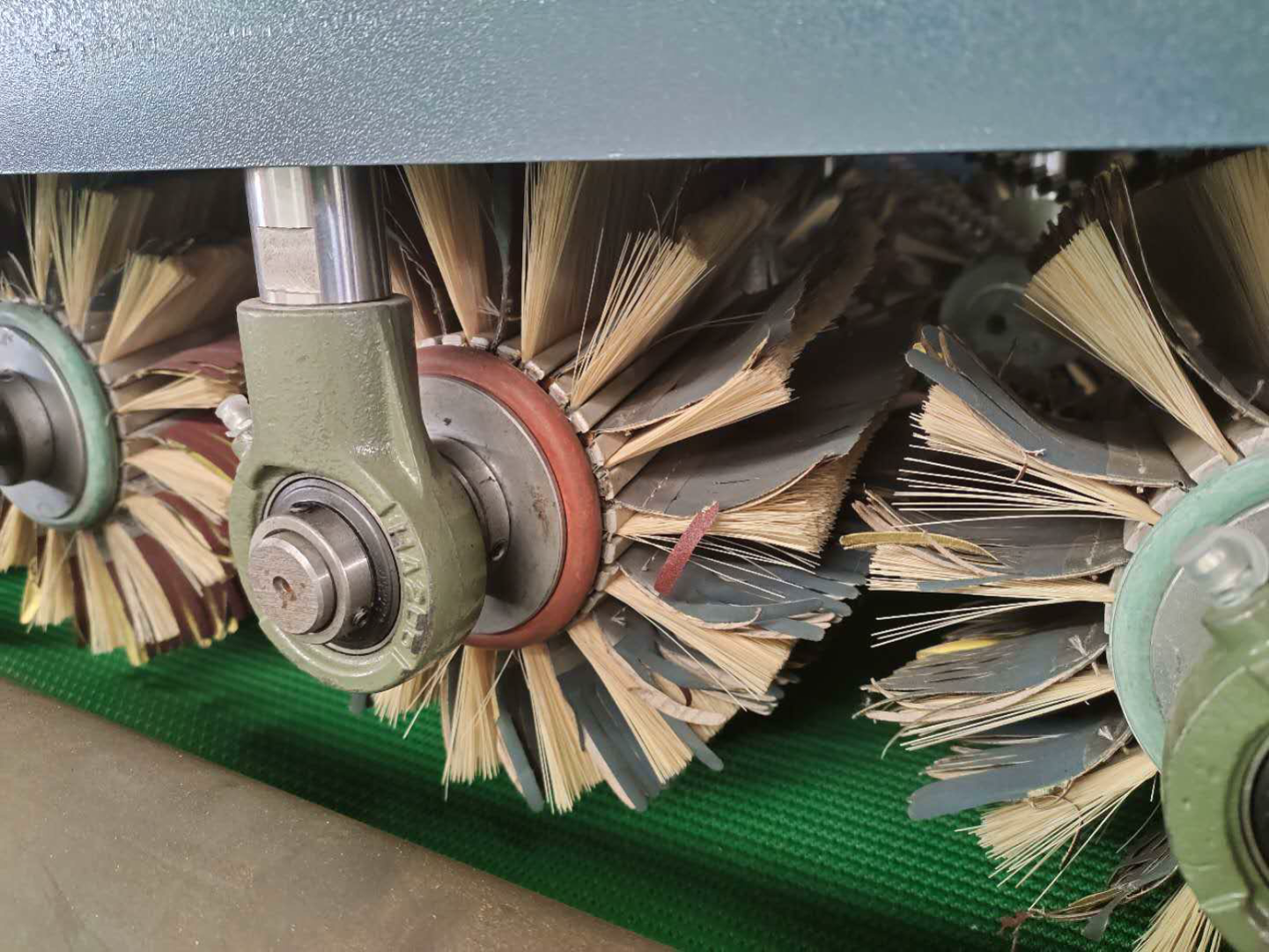 Первым этапом заготовка обрабатывается сдвоенным поперечными шлифовальным блоком, со спирально расположенными на барабанах щетками. Вторым этапом идет обработка сдвоенным блоком чашечных щеток. (Поперечный и чашечный блоки имеют механизм осцилляции) Третьим этапом обработки является Сдвоенный продольный шлифовальный блок (два барабана во всю ширину рабочего стола, с щетками расположенными по спирали)