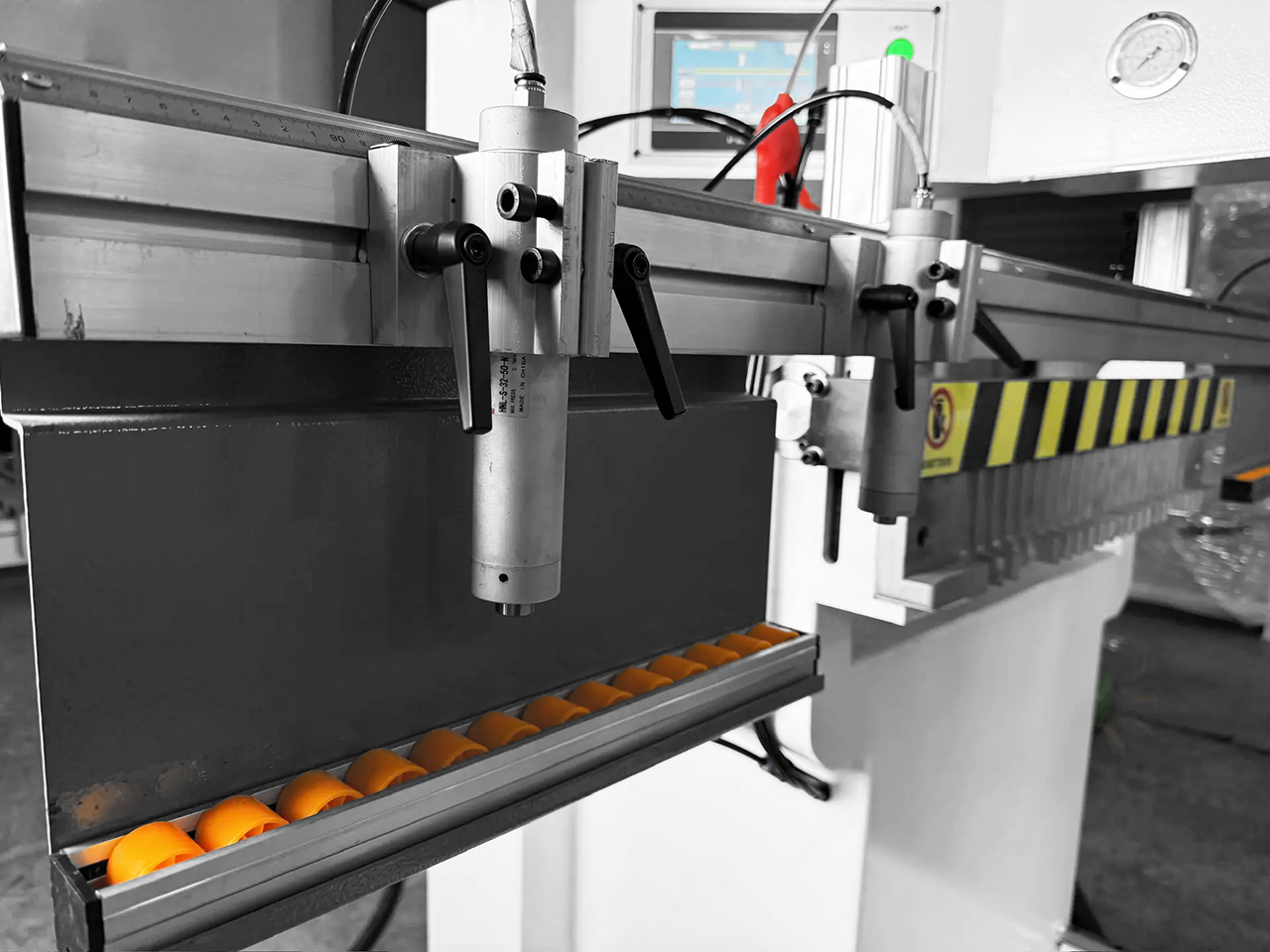 За фиксацию деталей в процессе цикля сверления отвечают 4 регулируемых пневматических прижима.