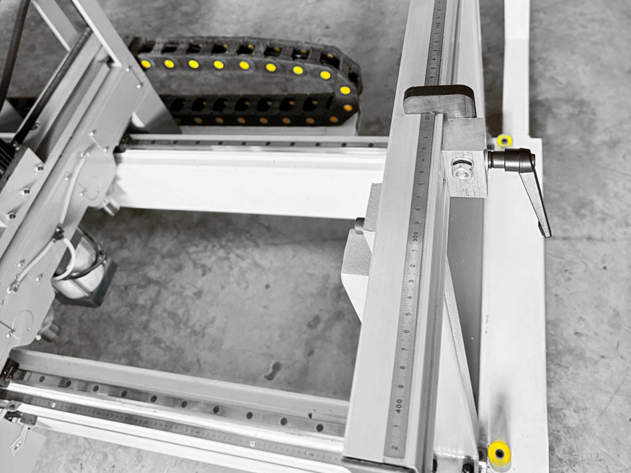 Фиксация траверсы на заданном размере производится с помощью механического тормоза, активируемого переключателем, расположенным рядом с электронным табло.