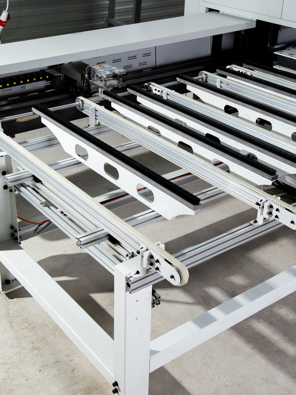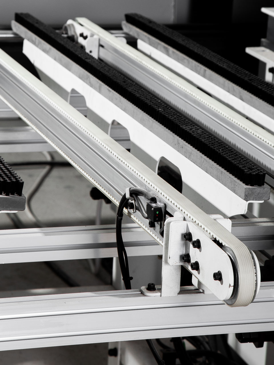 Программно-управляемый боковой упор с обрезиненными роликами для надежного и точного позиционирования детали.