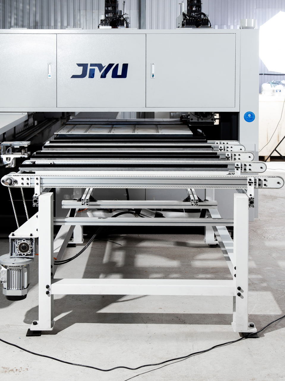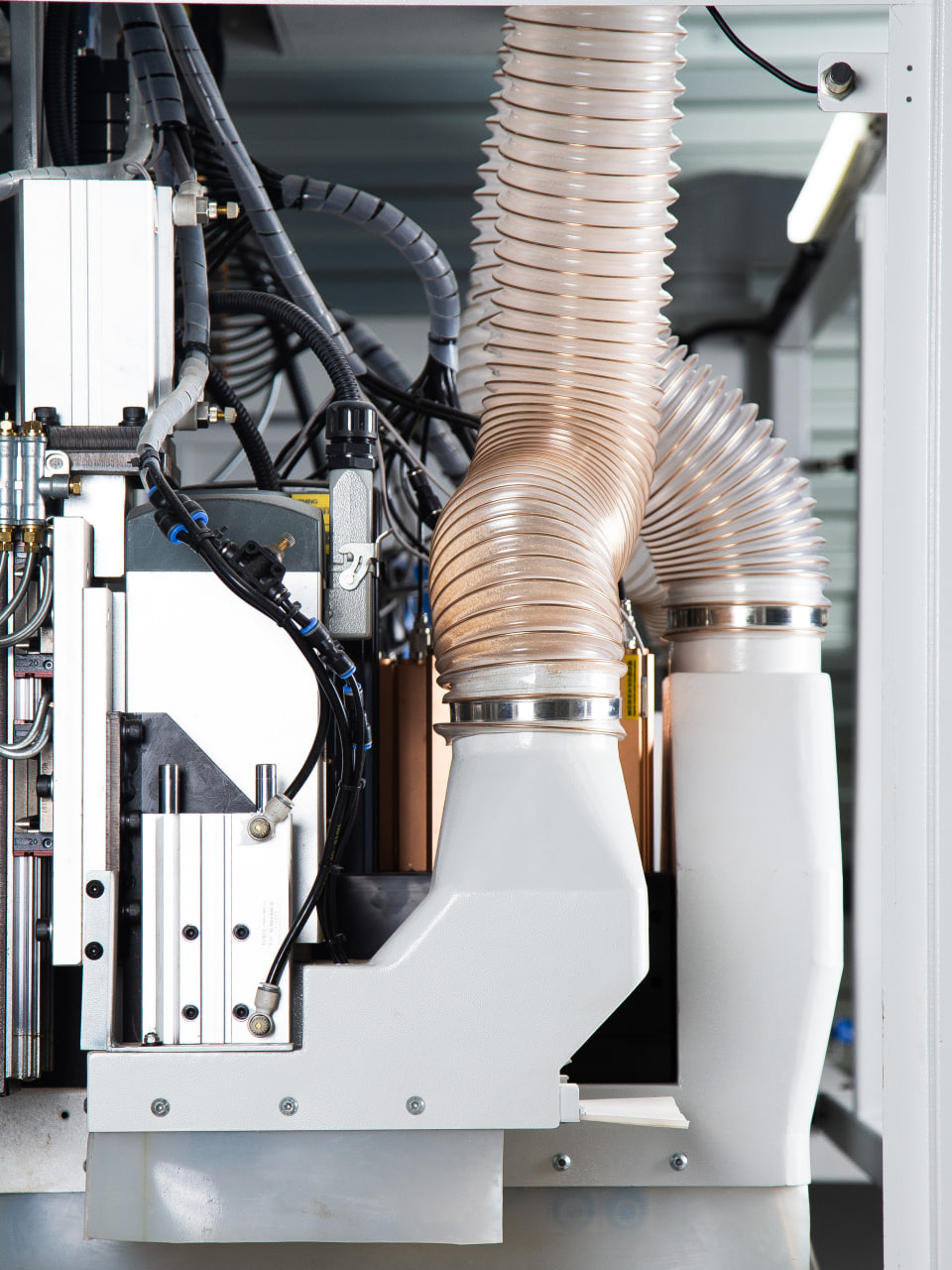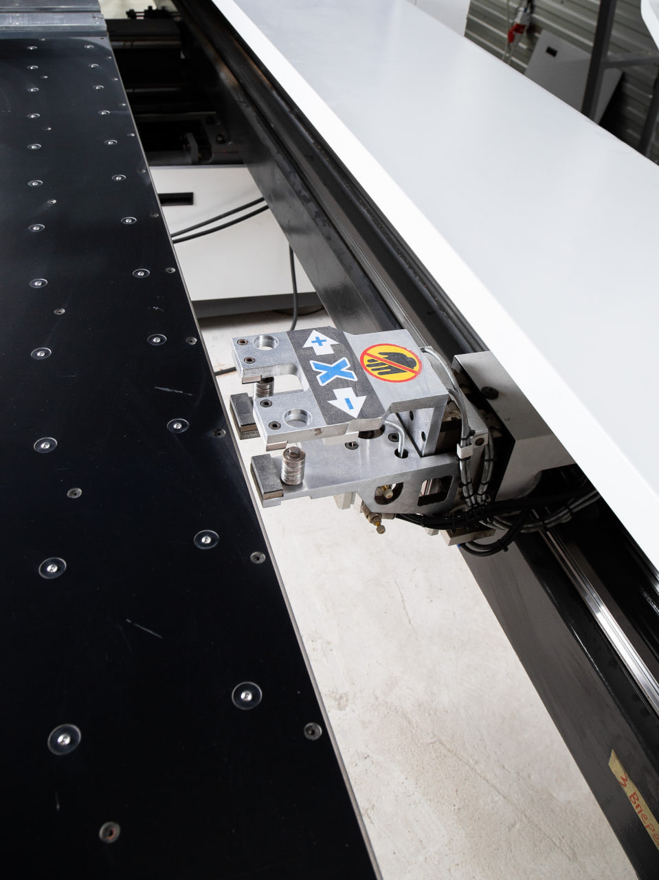 Оборудован системой поддува, это позволяет без особых усилий подавать заготовку в зону обработки и избегать царапин на поверхности материала.