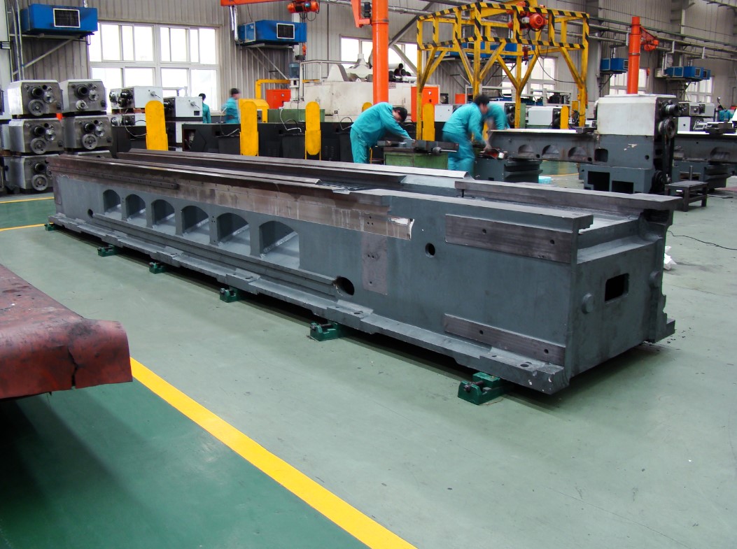Мощная цельнолитая станина с широко разнесёнными направляющими и дополнительными ребрами жесткости отлита из чугуна. Такая конструкция станины обеспечивает повышенную жесткость, виброустойчивость и способна выдерживать большие нагрузки. Возможна обработка деталей массой до 8 т (при зажатии в центрах и люнетах).