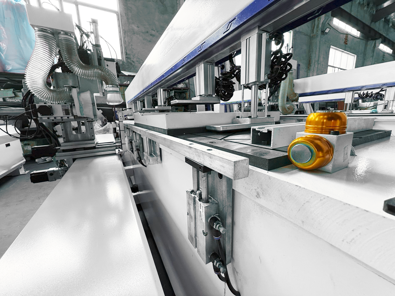 Прижимные устройства с возможностью перемещения в зависимости от длины обрабатываемых деталей.