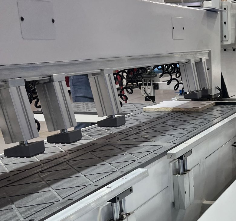 Прижимные устройства с возможностью перемещения в зависимости от длины обрабатываемых деталей.