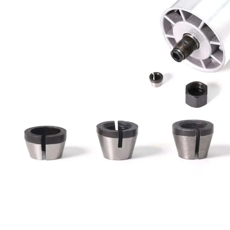 Цанговый патрон для кромочных фрезеров с диаметром хвостовика 6,35 мм. Данный цанговый патрон позволяет расширить спектр фрез, применяемых с ручным фрезером.