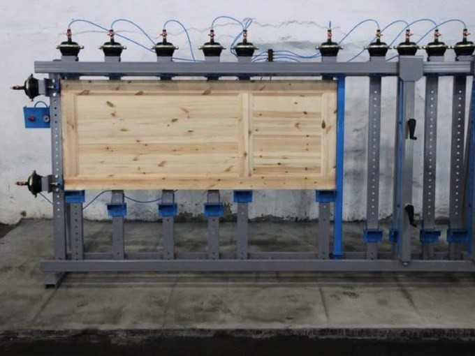 Частое расположение пневмоприжимов обеспечивает (при давлении в магистрали 10 МПа ) усилие до 4,2 тонн на один погонный метр склеиваемого щита и его равномерное распределение по длине щита. Данное усилие склейки позволяет склеивать щит толщиной до 100 мм, при этом указанное давление на 1 см2 склеиваемой поверхности составляет 4 кг, что удовлетворяет техническим условиям склейки древесины практически для всех клееных массивов.