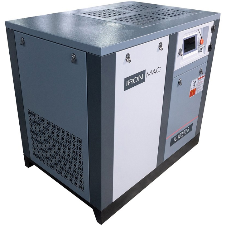Винтовой компрессор IronMac IC B из основной линейки, собран на прочной стальной раме. Компрессор предназначен для малых и средних предприятий, а все узлы конструкции фиксируются к жесткому основанию и дополнительно изолируются от вибраций. На серии IC B реализована система ременного привода через клиновые ремни, а двигатель имеет уровень защиты от IP 23 до IP 55.