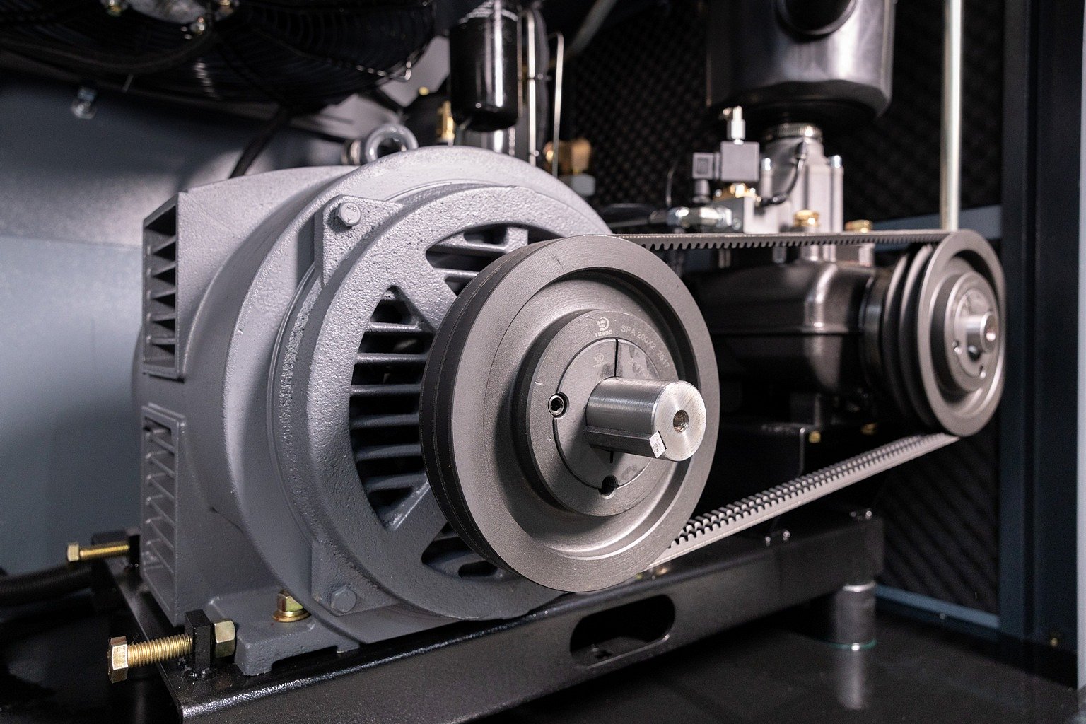 Клиновые ремни передают до 97% КПД с электродвигателя на винтовой блок, а также способствуют исключению вибрационных нагрузок во время пуска компрессора. Конструкция максимально проста, у неё самый высокий показатель удобства обслуживания приводных механизмов. Общая масса компрессора будет выше, чем на прямом приводе, что способствует устойчивости конструкции к вибрации и раскачиванию.